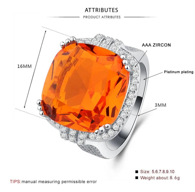 This square large orange gem ring is perfect for bohemian style weddings. It features micro-inlaid zircon for added sparkle, making it a stunning piece of party jewelry.