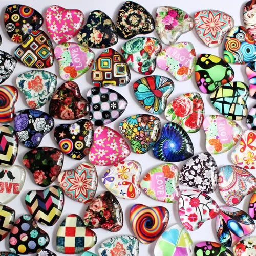 Get a set of 10 heart pattern glass cabochons with flatback trays. Each cabochon measures 25mm and features a mixed heart pattern design.