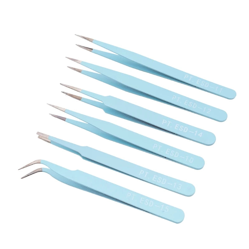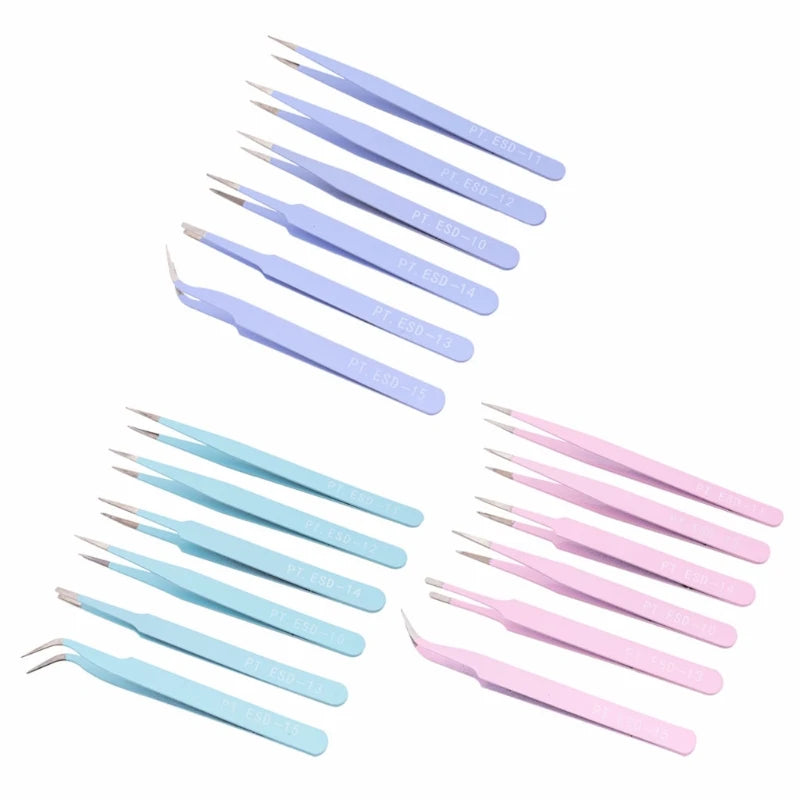 This 6-piece tweezers set is made of stainless steel with anti-static coating, suitable for electronics, silicone, resin, and jewelry making.