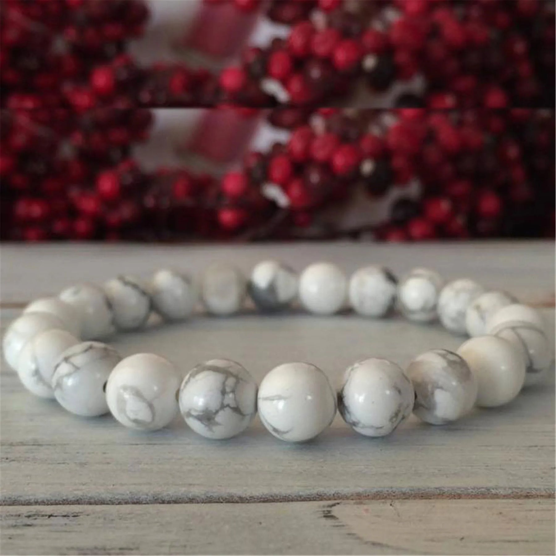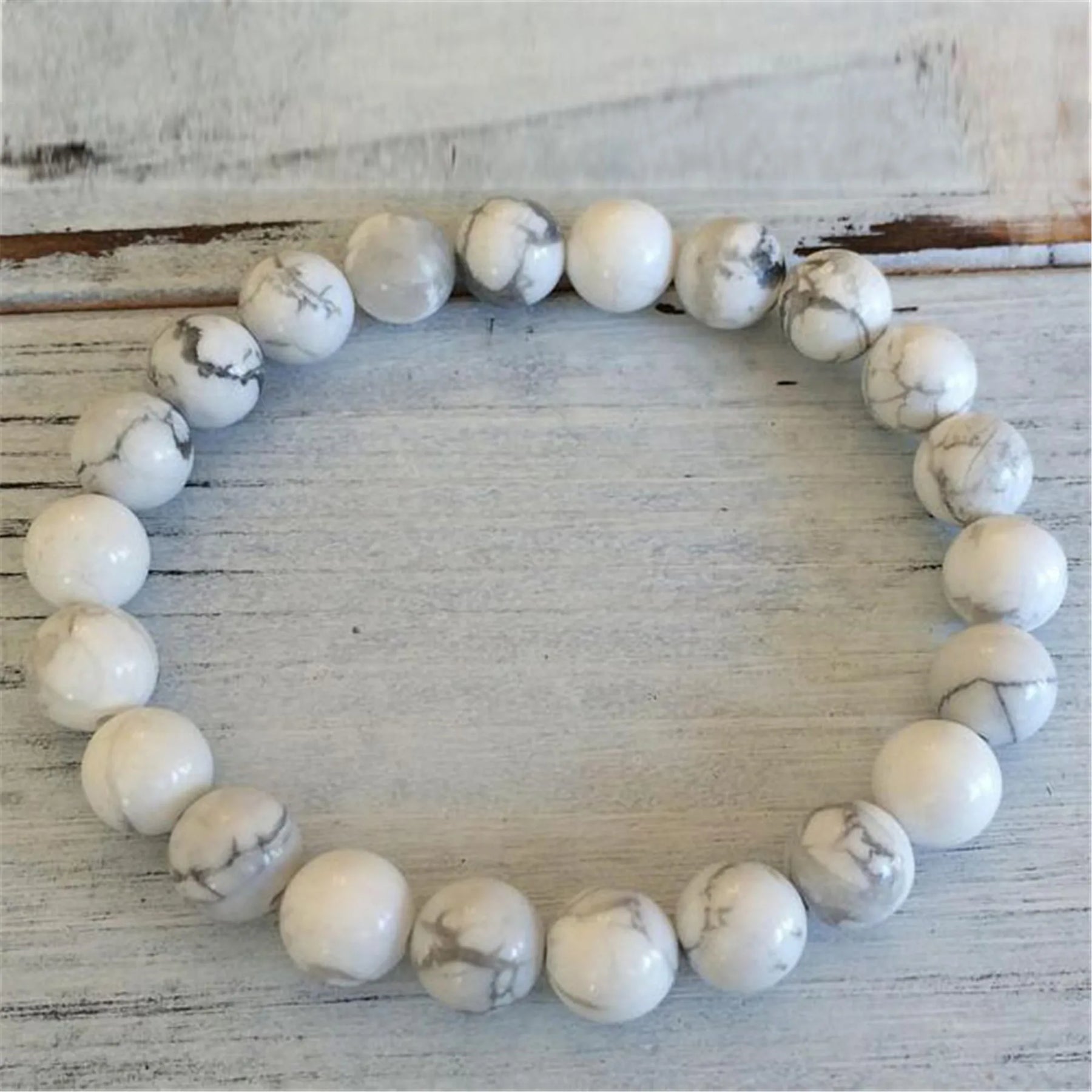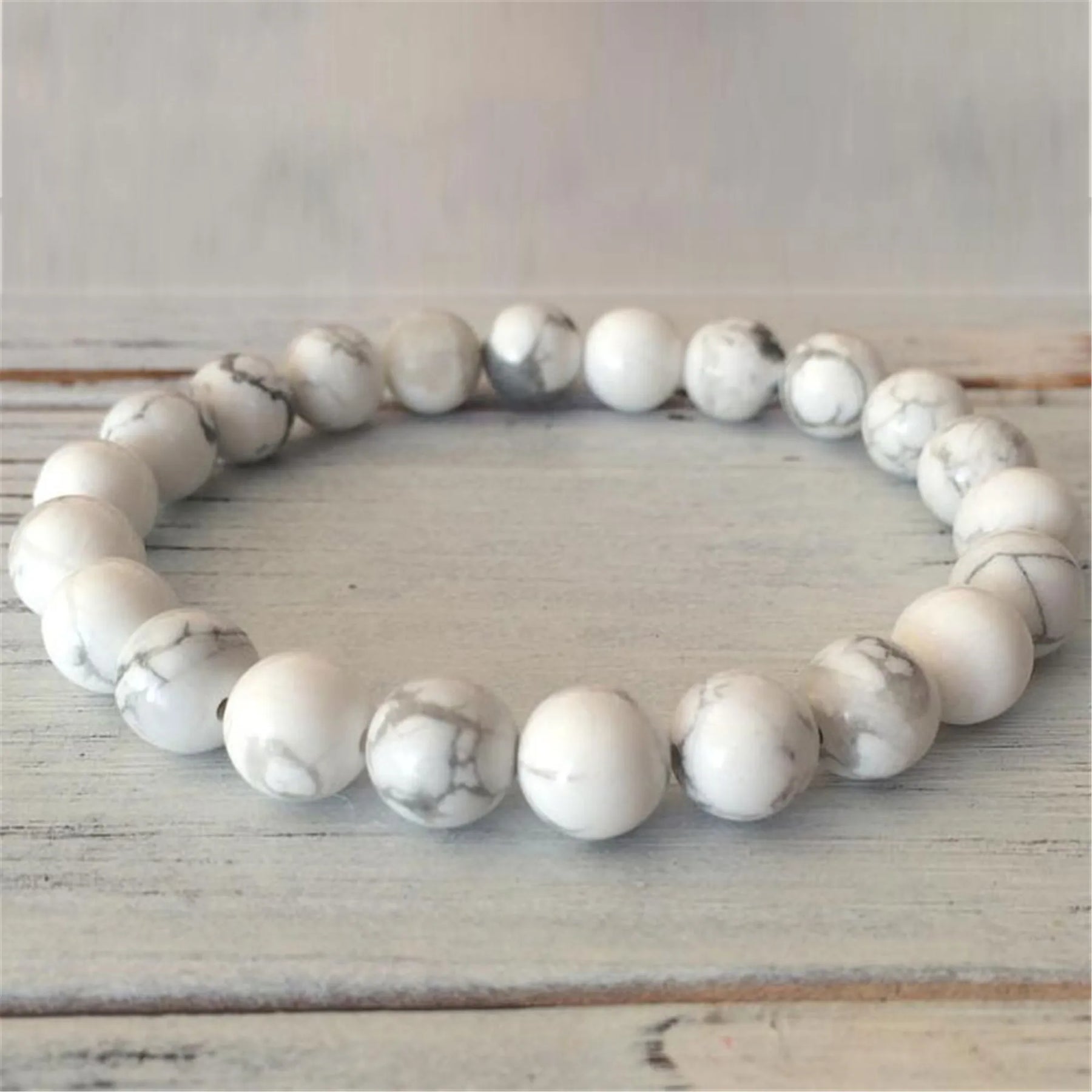 This bracelet features 8mm Howlite beads, known for their calming properties. It is 7.5 inches long and serves as a prayer, chakra, and lucky wrist accessory with natural blessing.