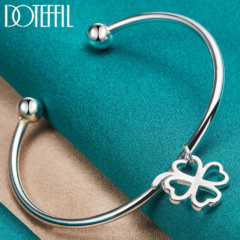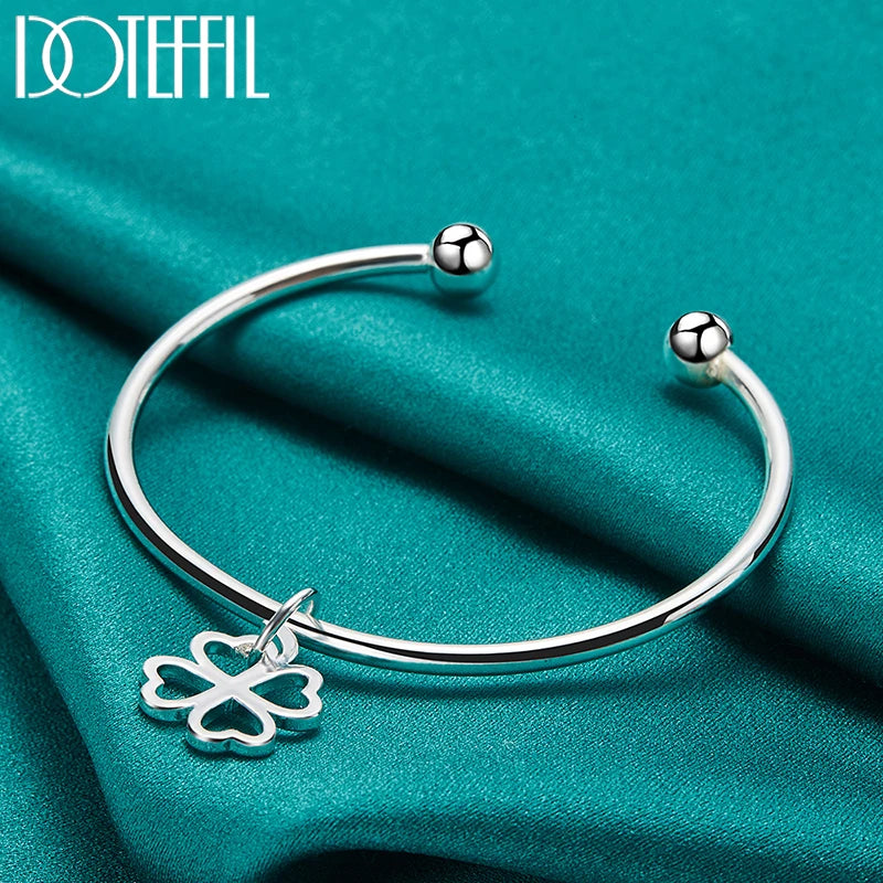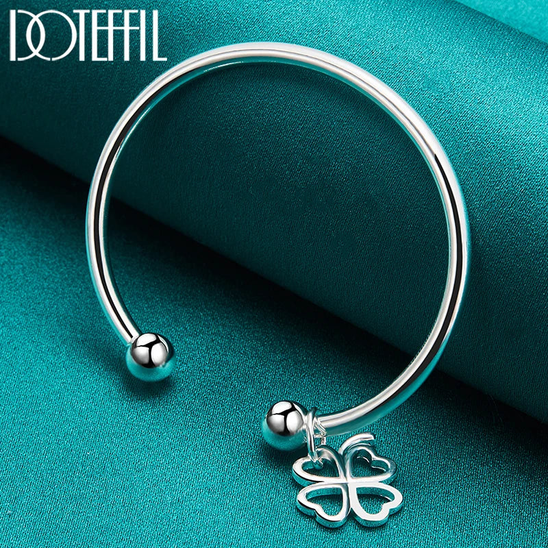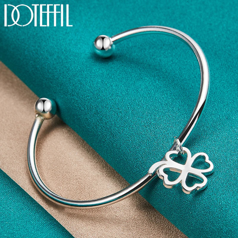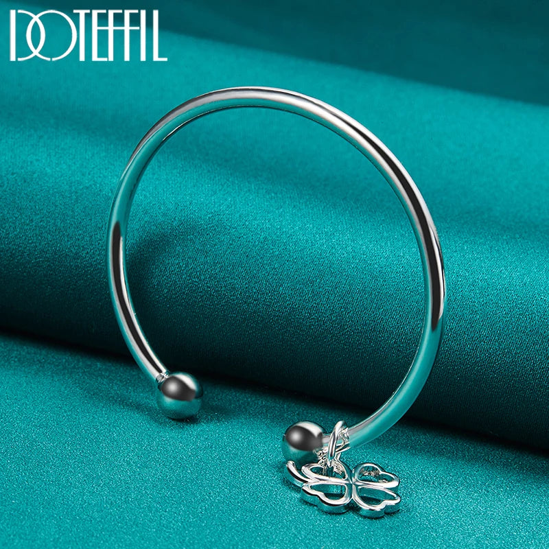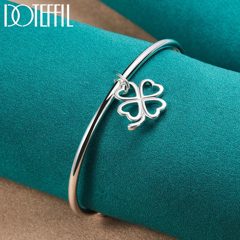 Elegant 925 sterling silver bangle bracelet featuring a four-leaf clover design. Perfect for weddings, engagements, and parties.
