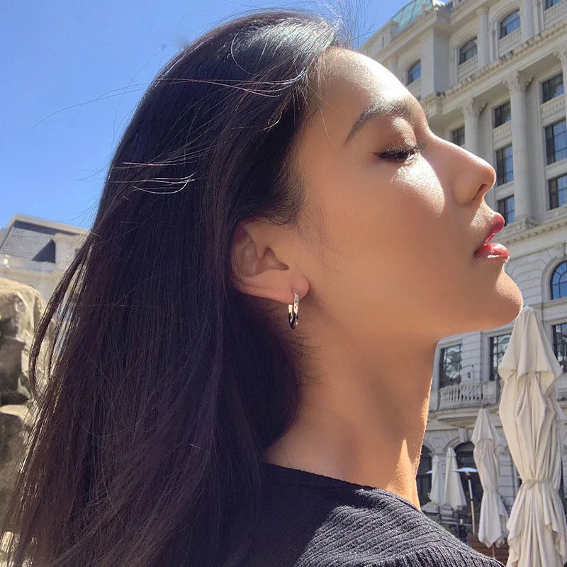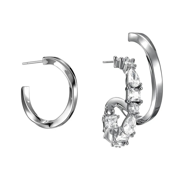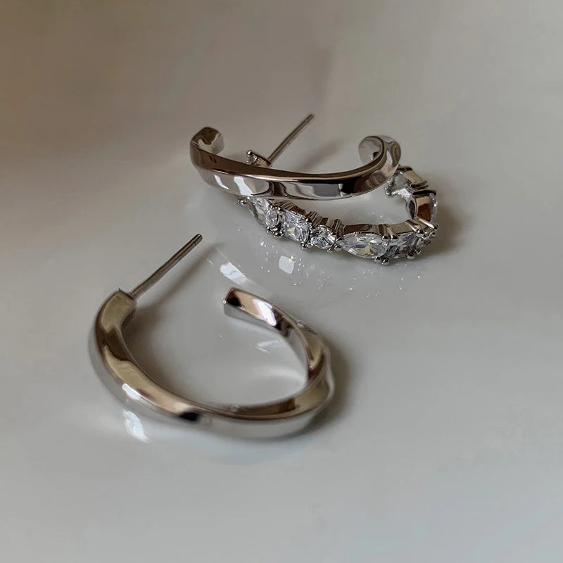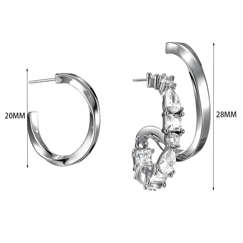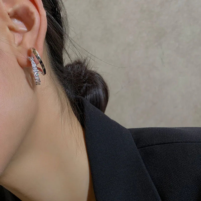 These stunning earrings feature an elegant asymmetric design with French geometric hoops and zircon drops, perfect for adding a touch of glamour to any outfit.