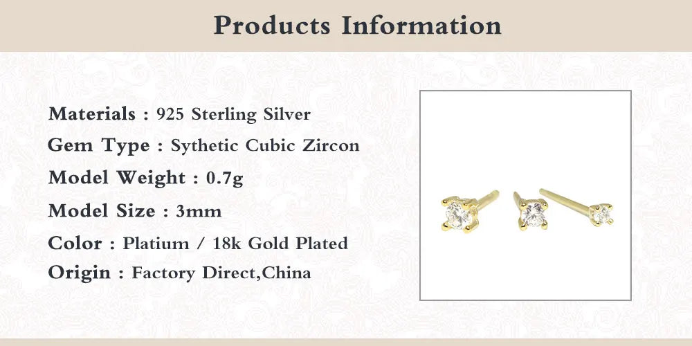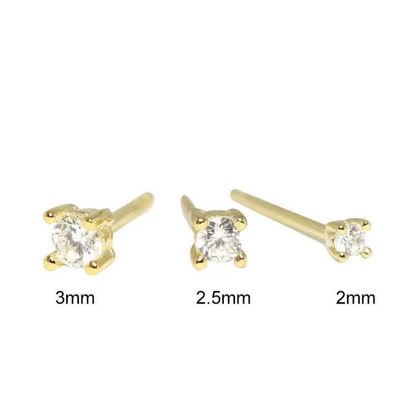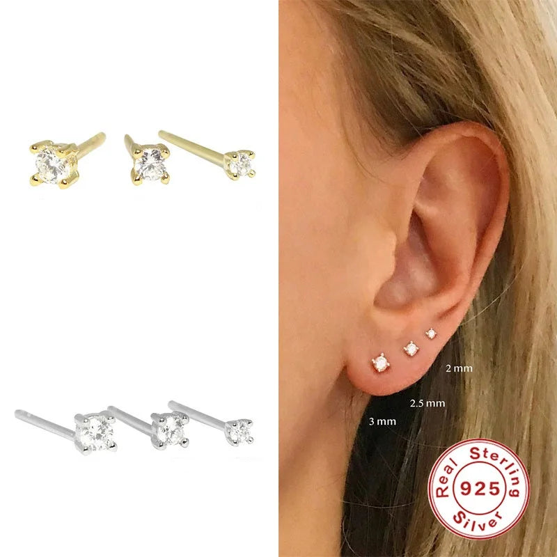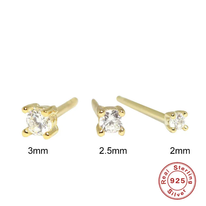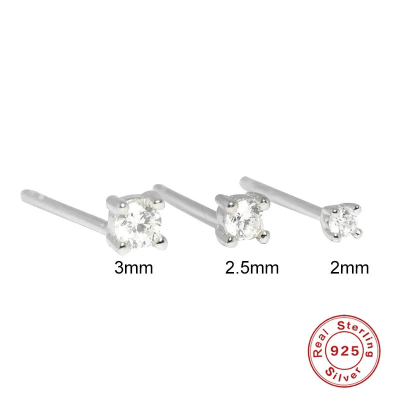 This set includes 3 elegant stud earrings with clear zircon stones. Made of 925 sterling silver, these earrings feature a minimalist design with four-claw diamond rhinestones. Available in sizes 2mm, 2.5mm, and 3mm.
