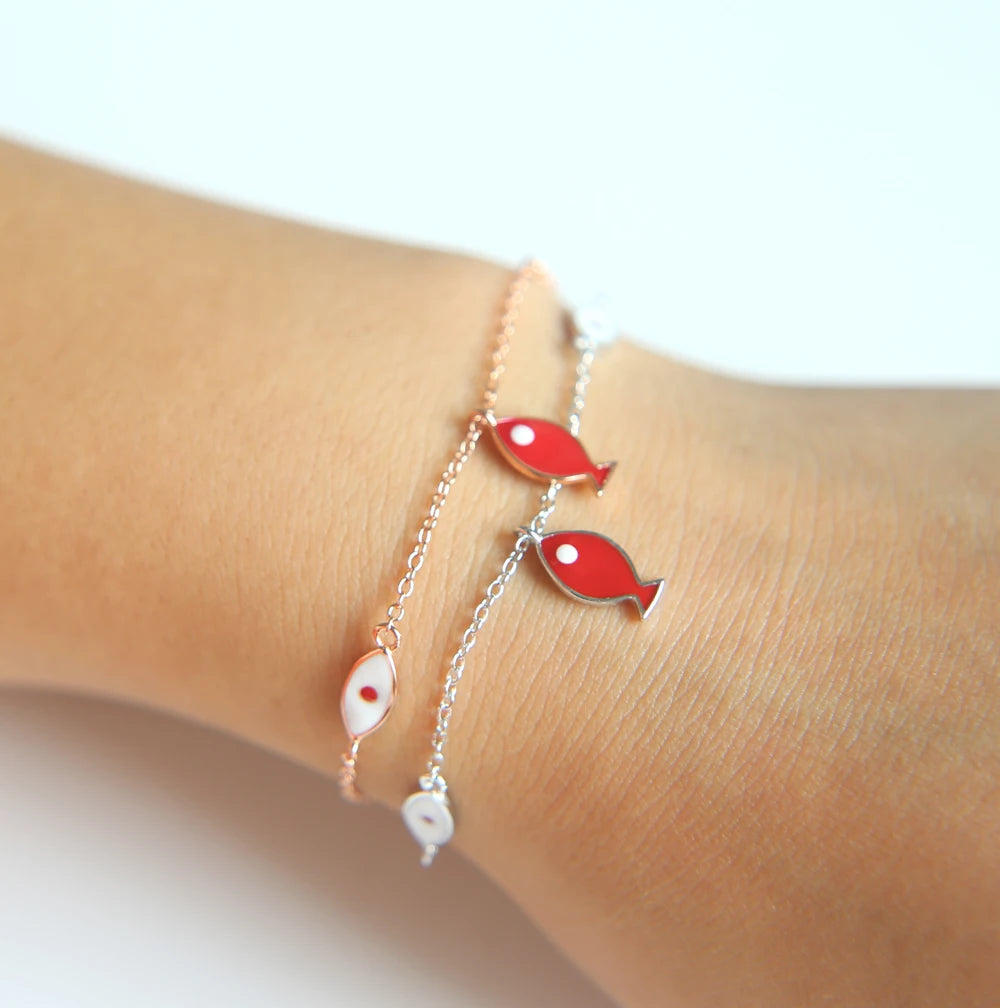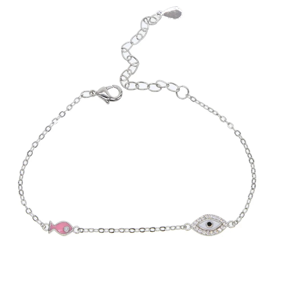This 925 sterling silver fish charm bracelet features a fish eye design with a heart charm. Perfect for party, wedding, or everyday wear.