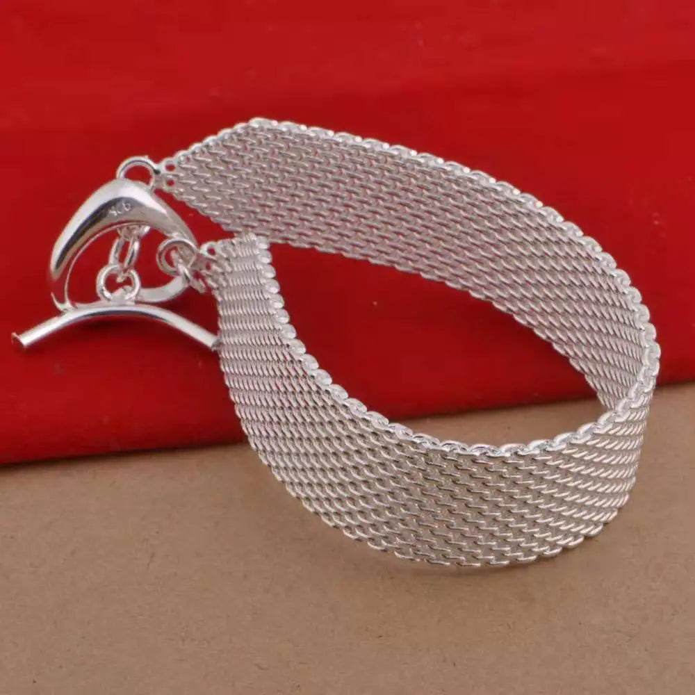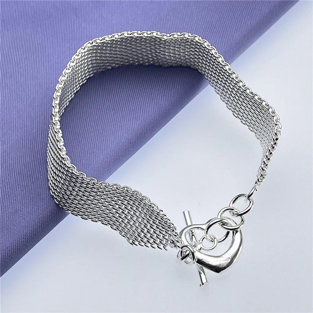 Elegant and stylish 925 sterling silver mesh bracelet with heart clasp, perfect for parties and weddings.