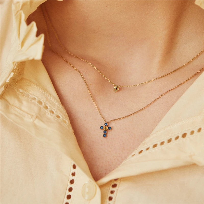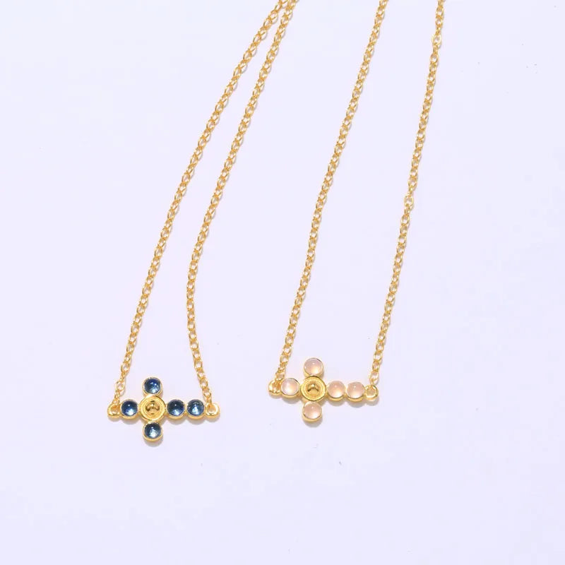 Elegant jewelry set featuring a pink enamel cross charm set in 925 sterling silver. Includes a bracelet, pendant necklace, and mismatched chain earrings.