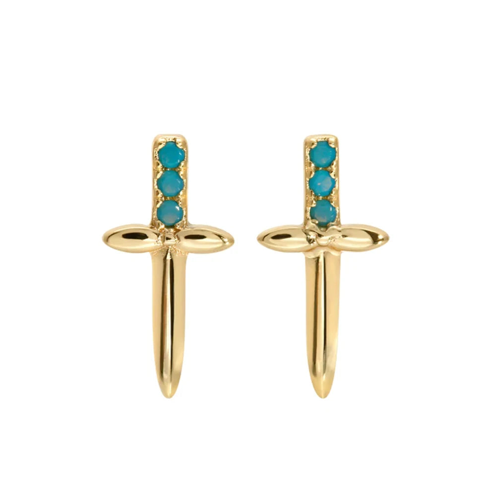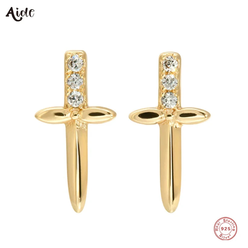 These small piercing stud earrings feature a cross dagger shape design with sparkling zircon stones set in 925 sterling silver. Perfect for daily wear or special occasions.