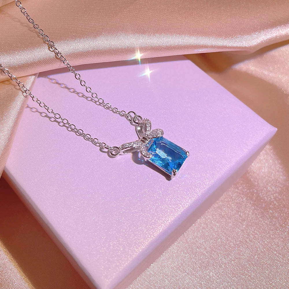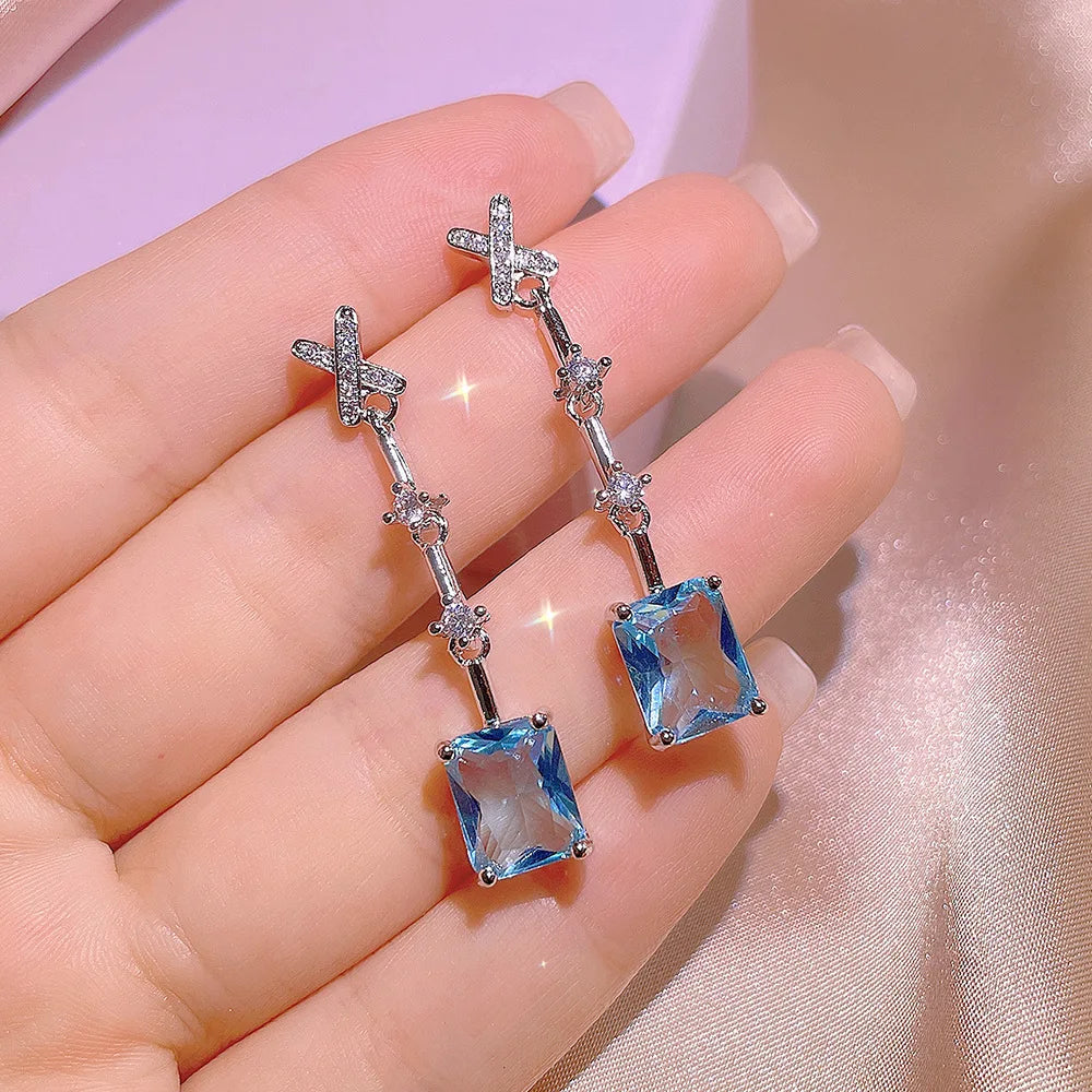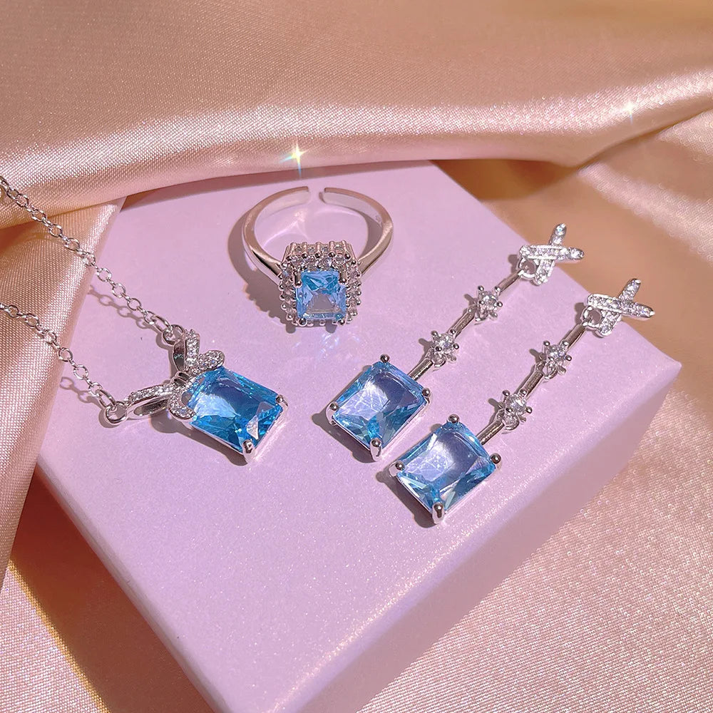 This elegant three-piece jewelry set includes a ring, pendant necklace, and tassel stud earrings made with delicate aquamarine sapphires. Perfect for engagement or bridal gift.