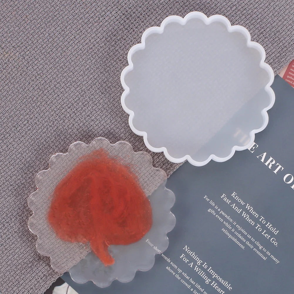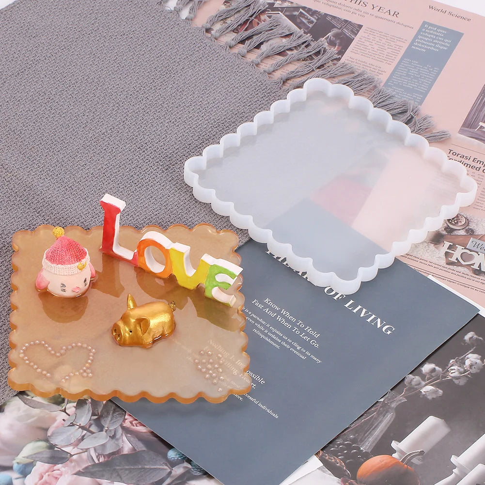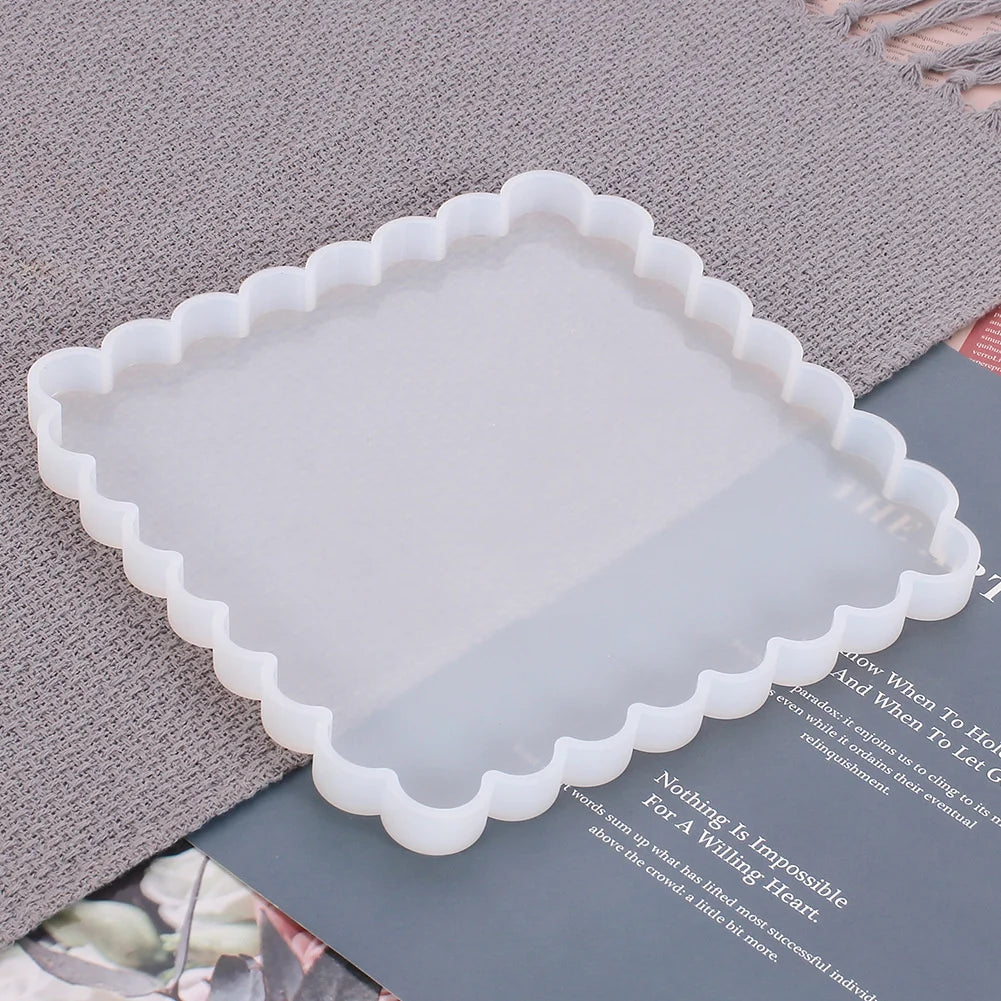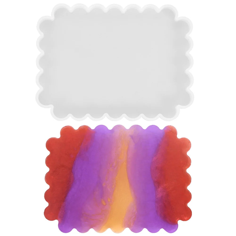 Create beautiful tray bases, jewelry storage, and crafts with this circular rectangle mold that features a lace wavy edge design. Made from high-quality silicone, it is perfect for epoxy resin projects.