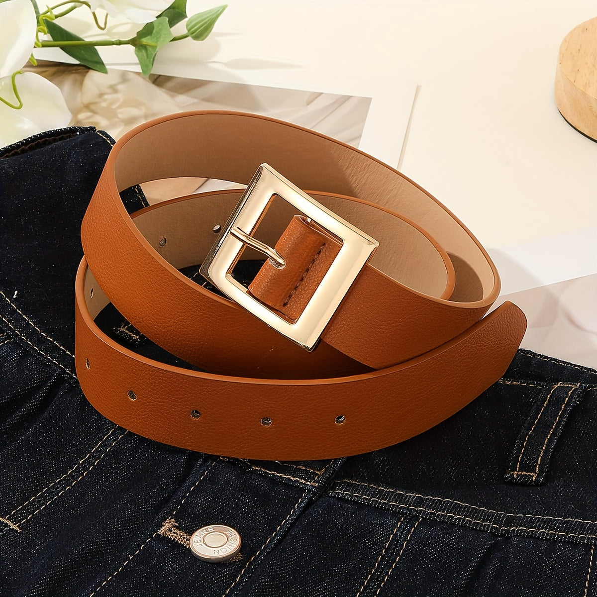 Classic Square Buckle PU Belt Embossed Solid Color Waistband for Women