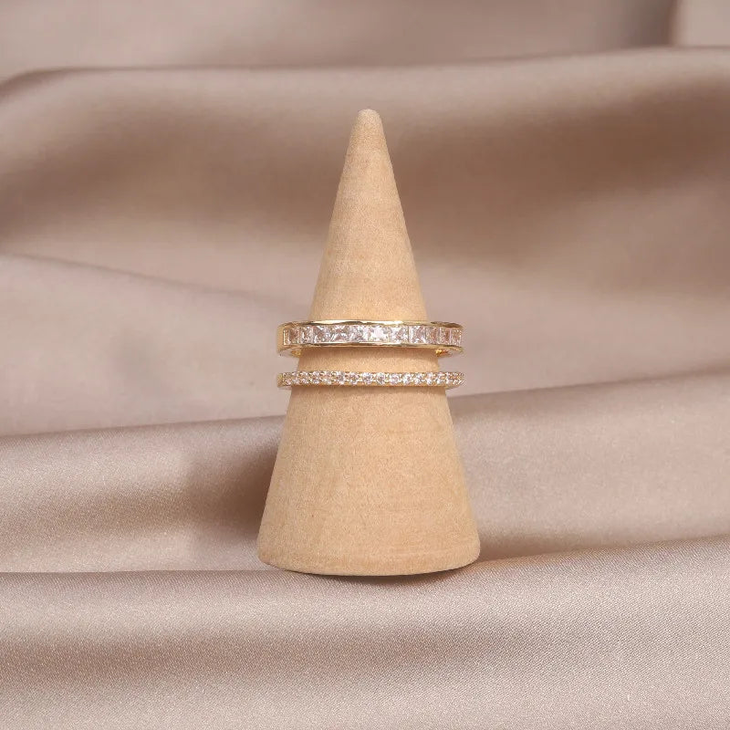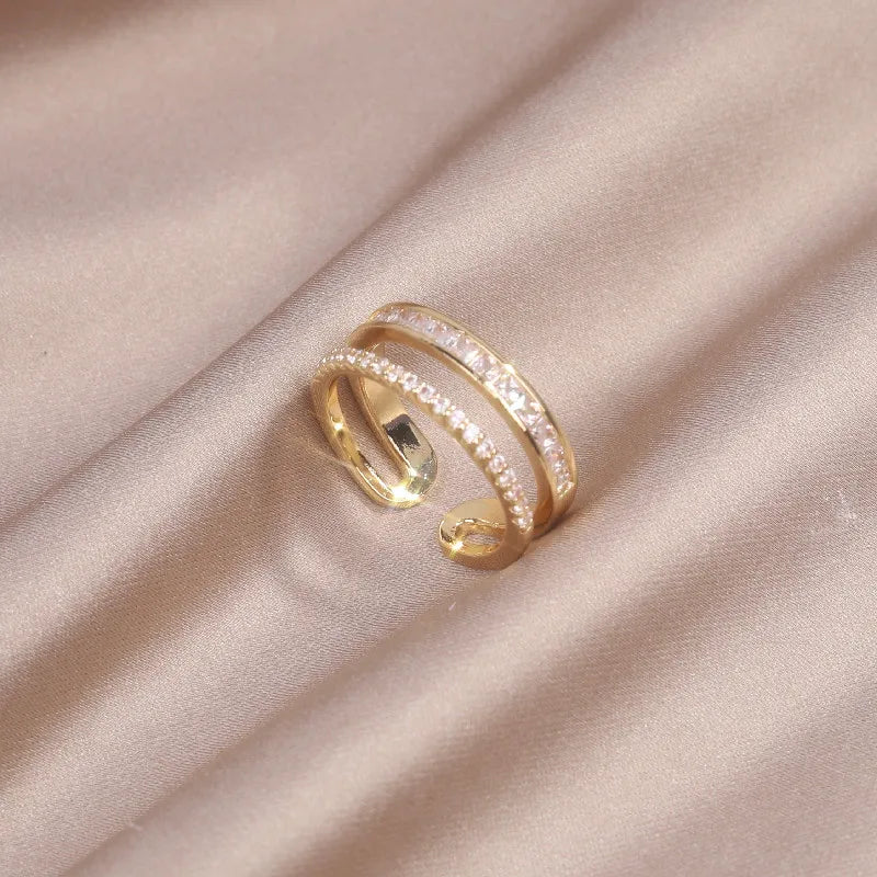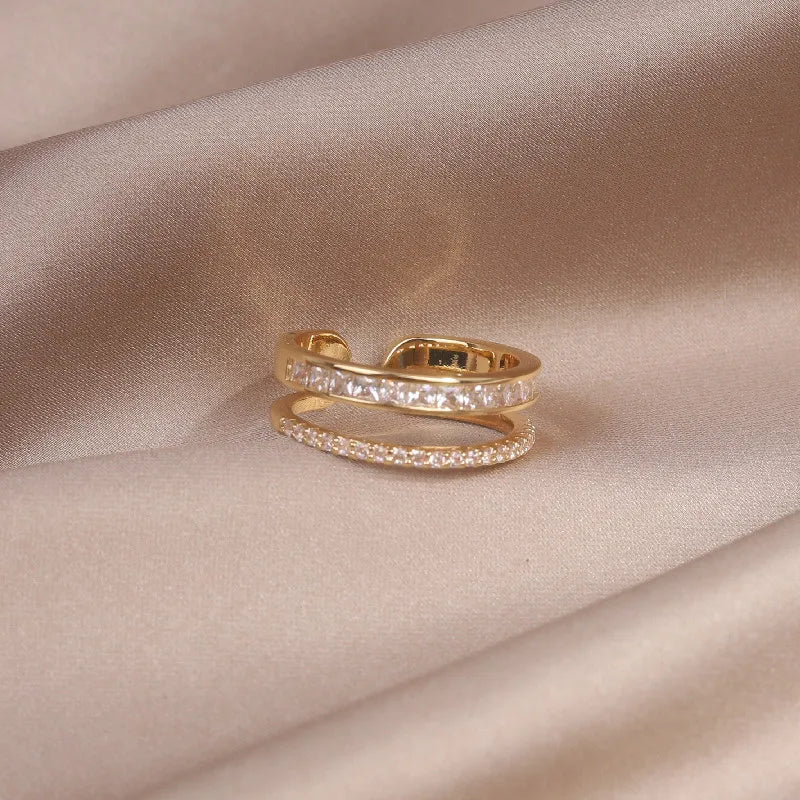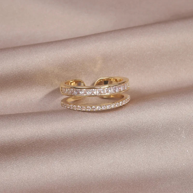 This stunning ring features 14K real plating and double zircon design, perfect for daily wear and work. Its adjustable opening ensures a comfortable fit all day long.