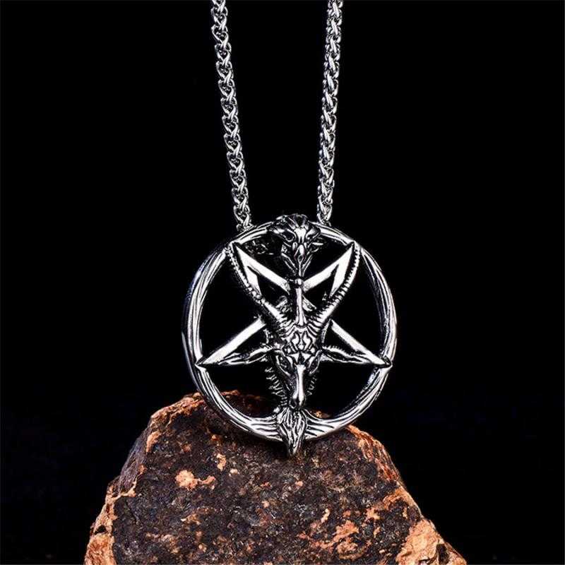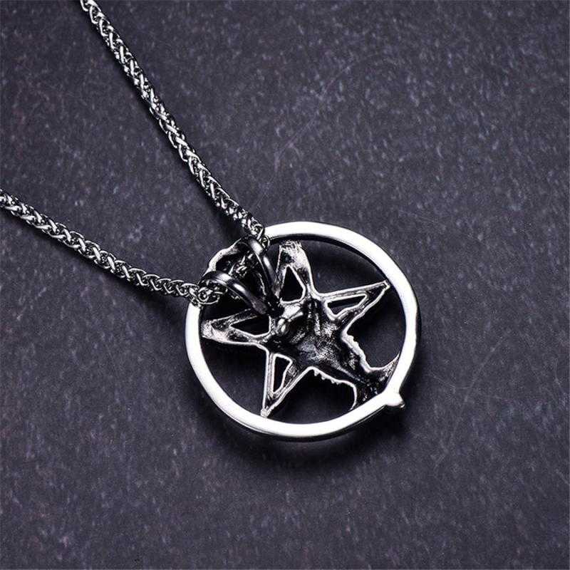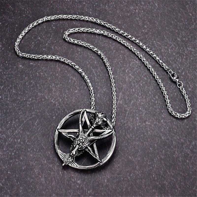 Men's Silver Plated Inverted Pentagram Goat Head Pendant With Wheat Chain