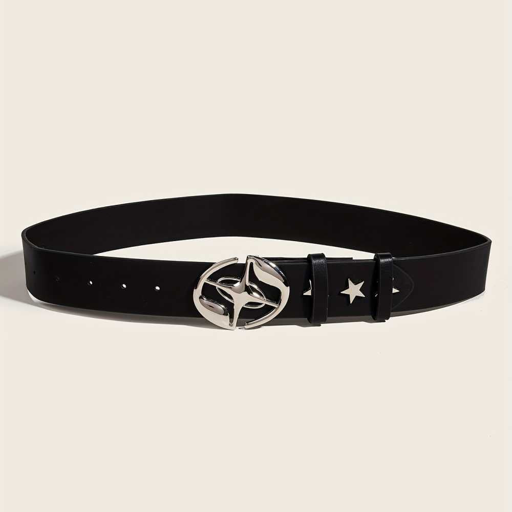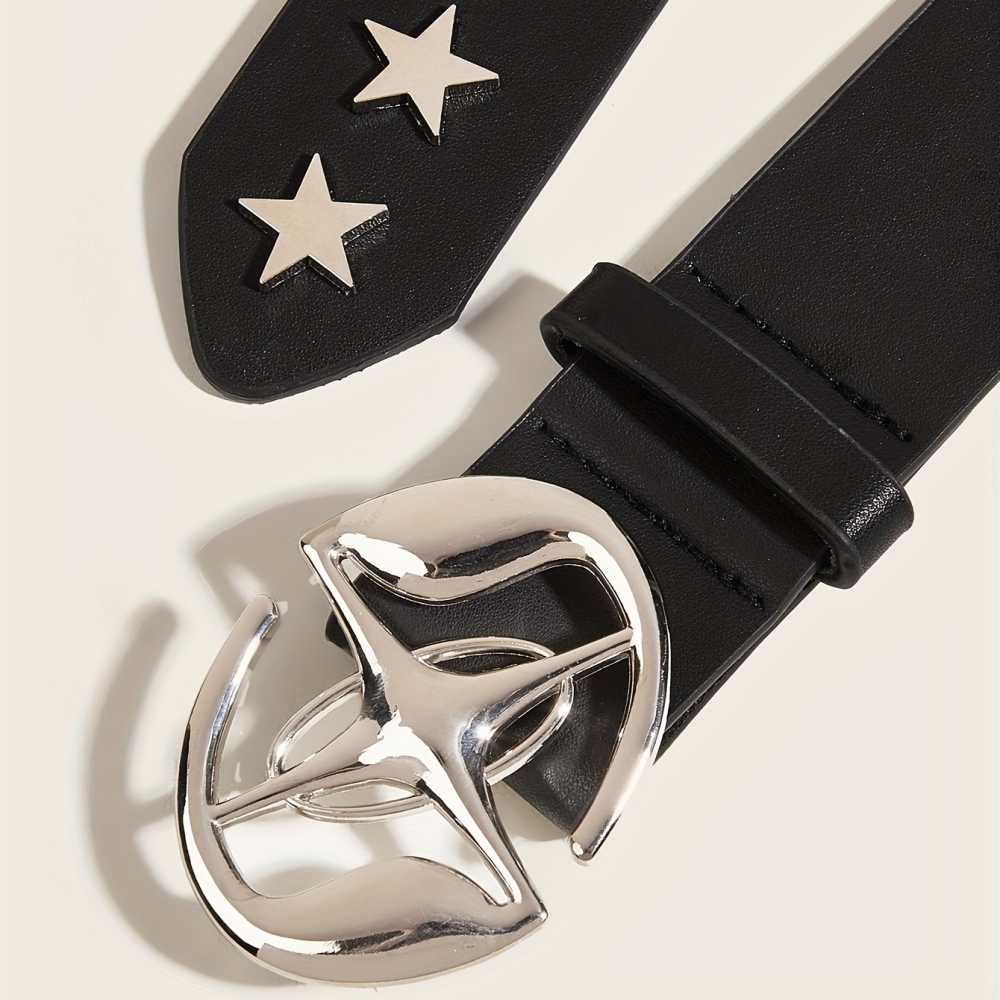 Oval Hollow Out Buckle Belt with Star Rivet Decor Black Casual PU Belt for Women