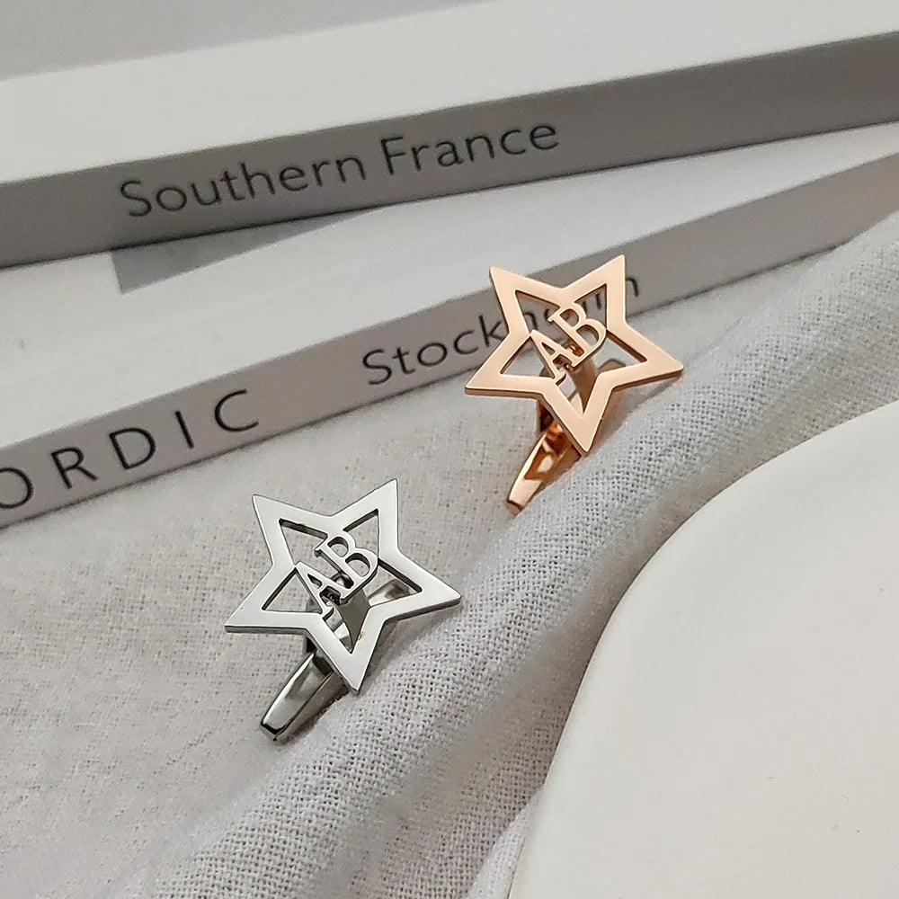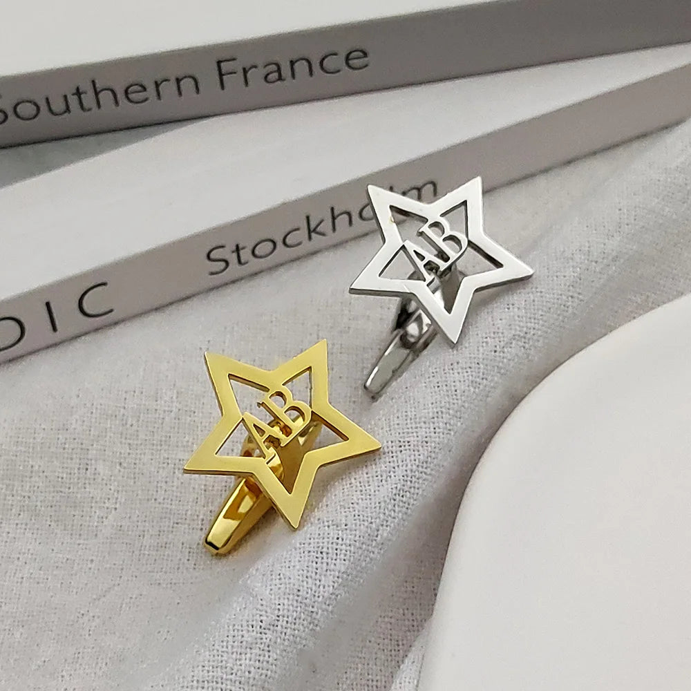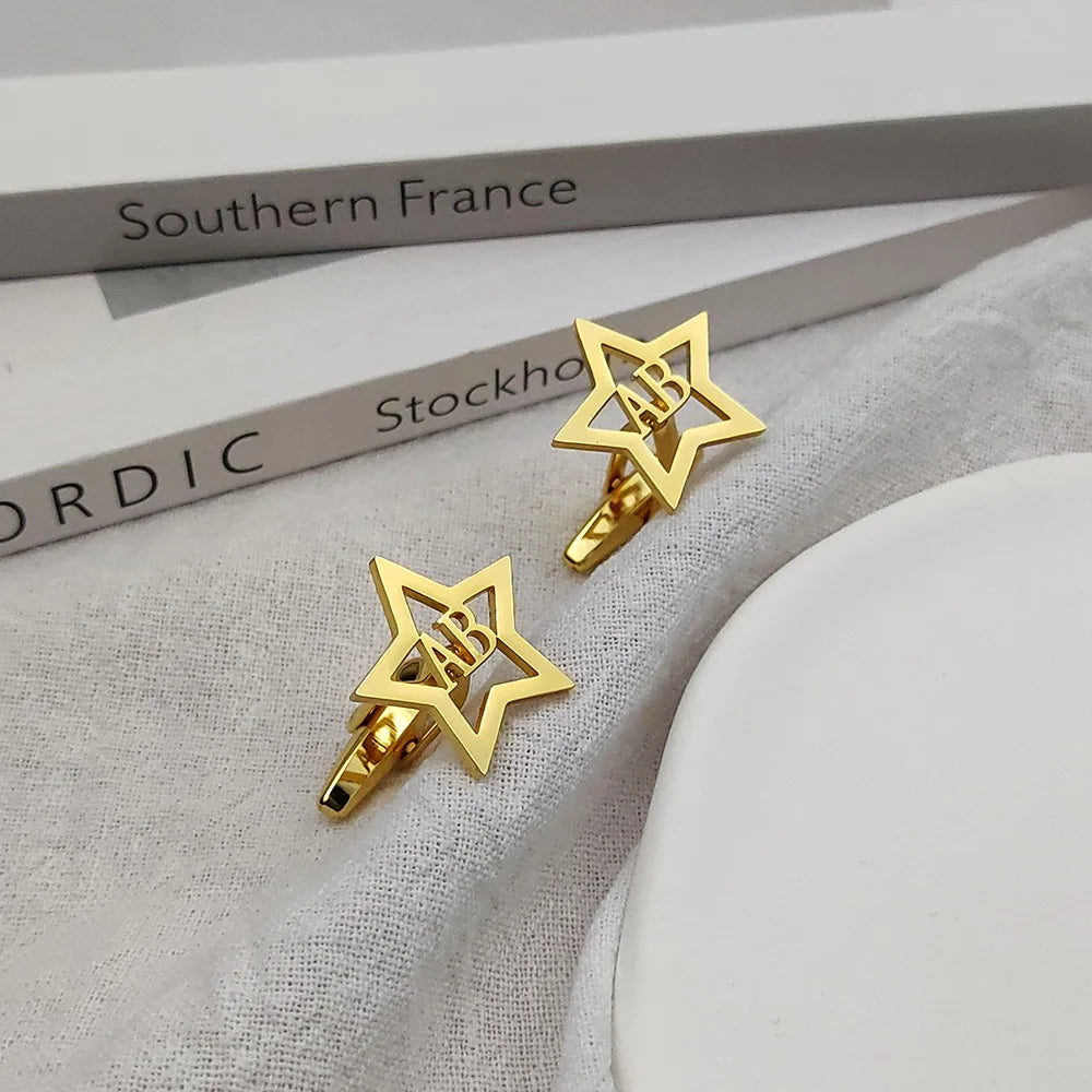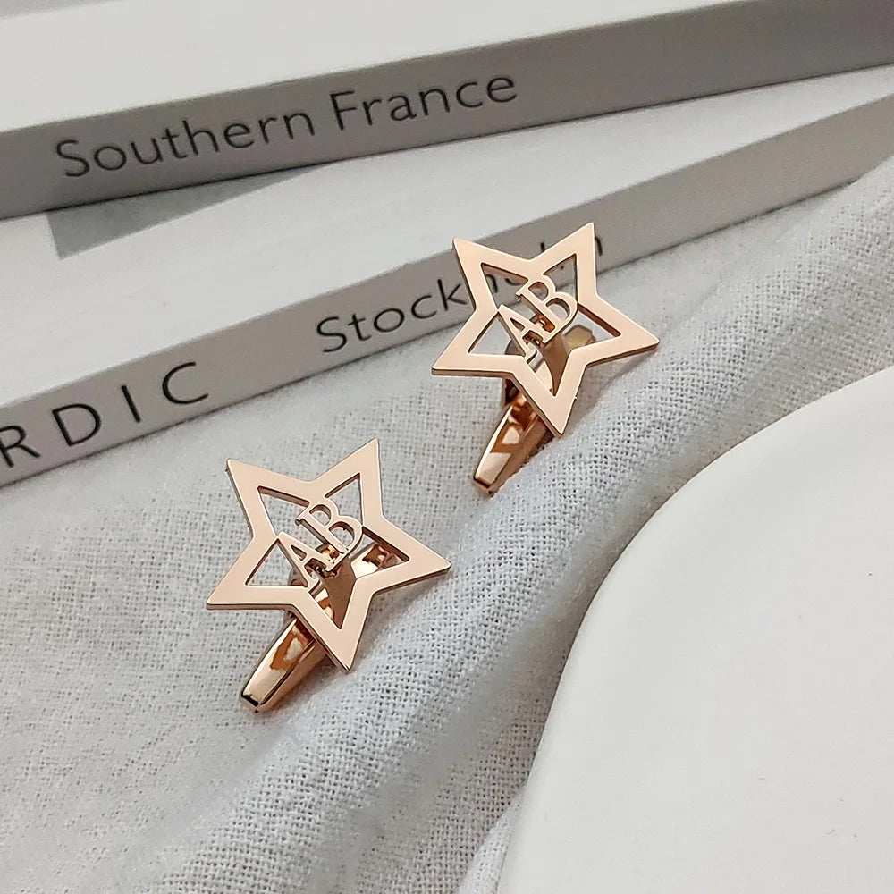 These stainless steel cufflinks feature a pentagram design and can be personalized with name initials. Perfect for men's jewelry and a thoughtful Father's Day gift.