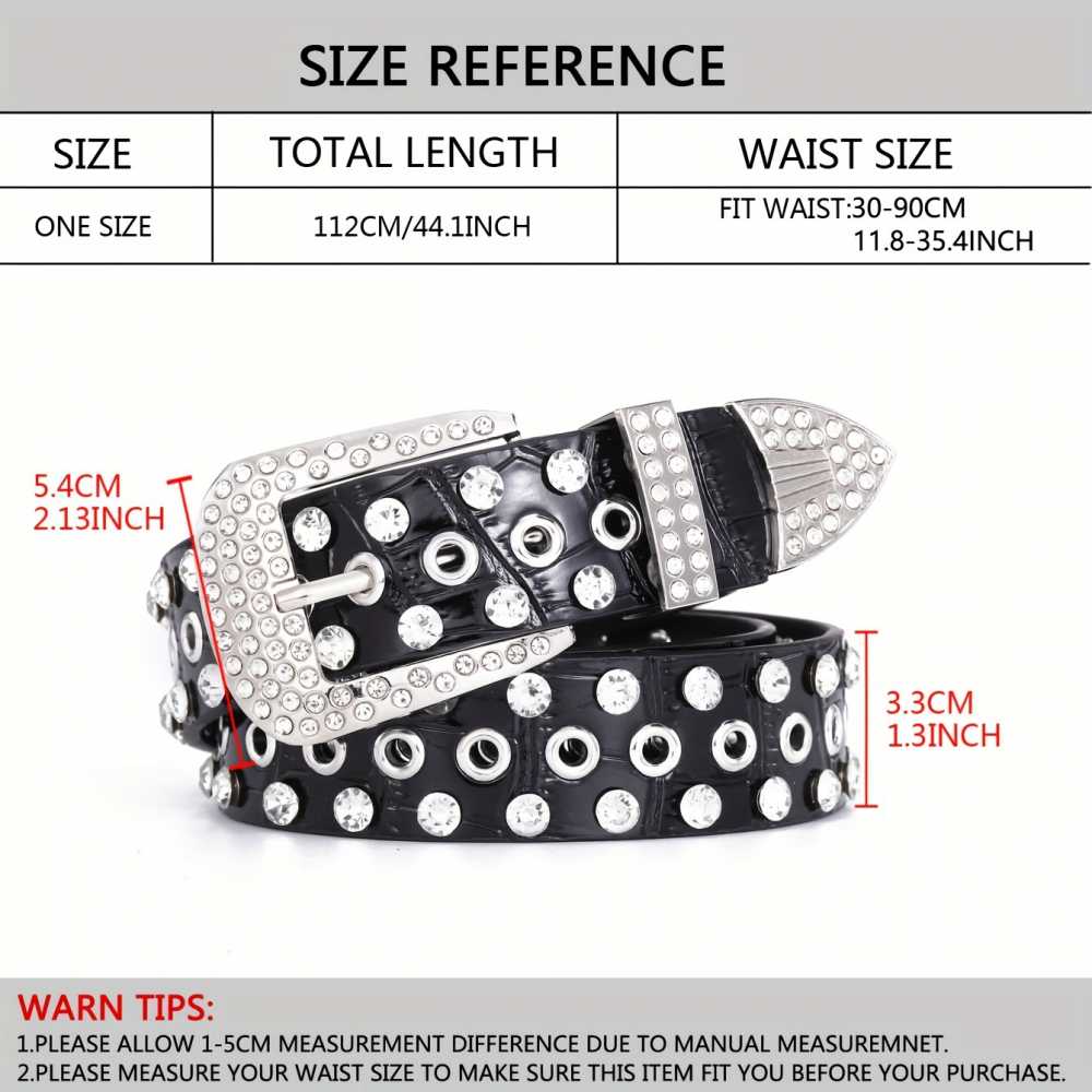 - Product Particulars: This belt is crafted from high quality leather and studded with sparkling cubic zirconia stones. The adjustable buckle allows for effortless resizing, comfortably accommodating different waistlines.