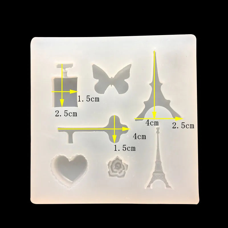 Create unique jewelry pieces with these liquid silicone molds. Perfect for making key, heart, butterfly, flower, and tower charms.