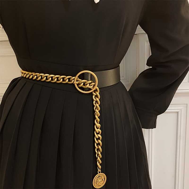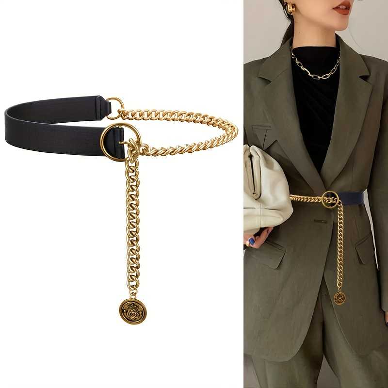 Enhance your wardrobe with our Vintage Inspired Chain Stitching Belt. This elegant accessory features an adjustable design with a striking metal chain pendant, making it a versatile addition to any outfit. Perfect for pairing with women's suits, coats, skirts, or dresses, this belt adds a touch of sophistication and style. Whether you’re dressing up for a formal event or looking to elevate your casual look, this belt effortlessly transforms any ensemble. Crafted for both comfort and durability, it offers a secure fit while showcasing your unique fashion sense. Make a statement with this timeless piece that complements a variety of styles.