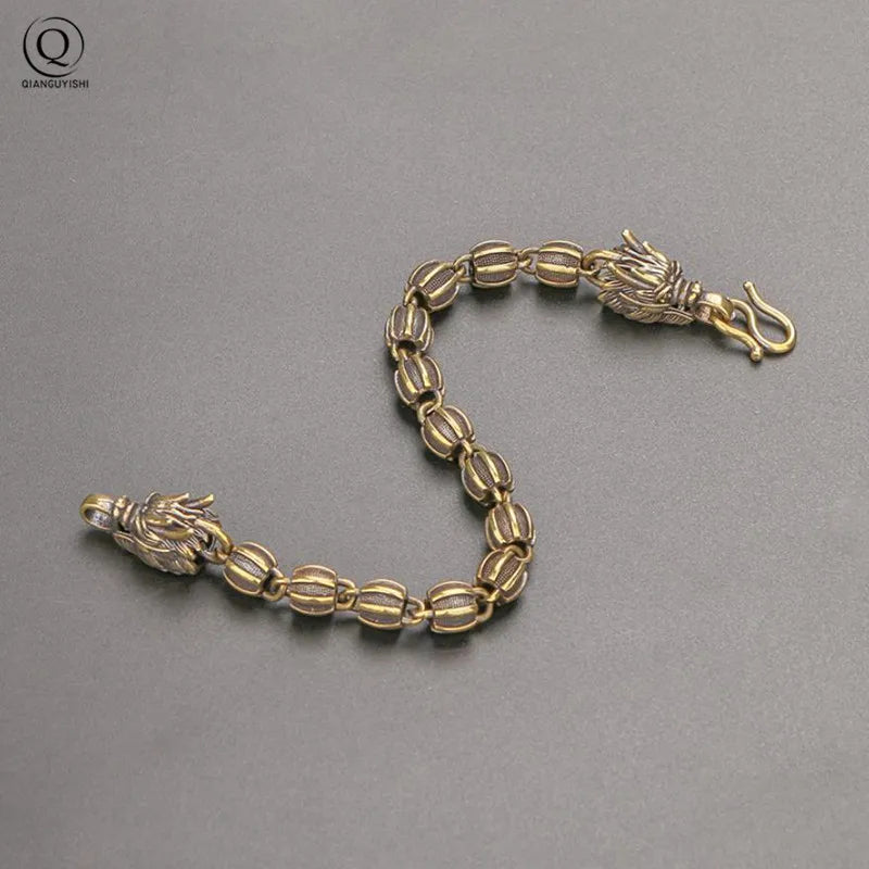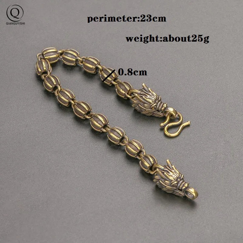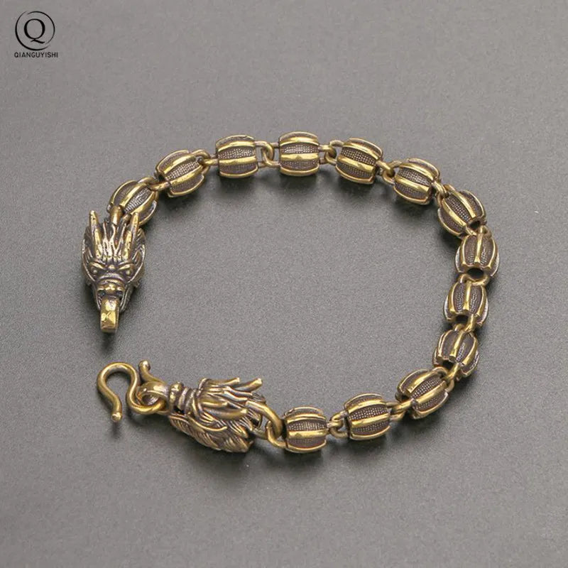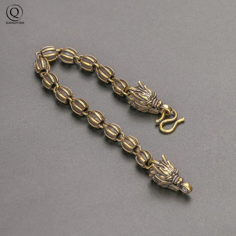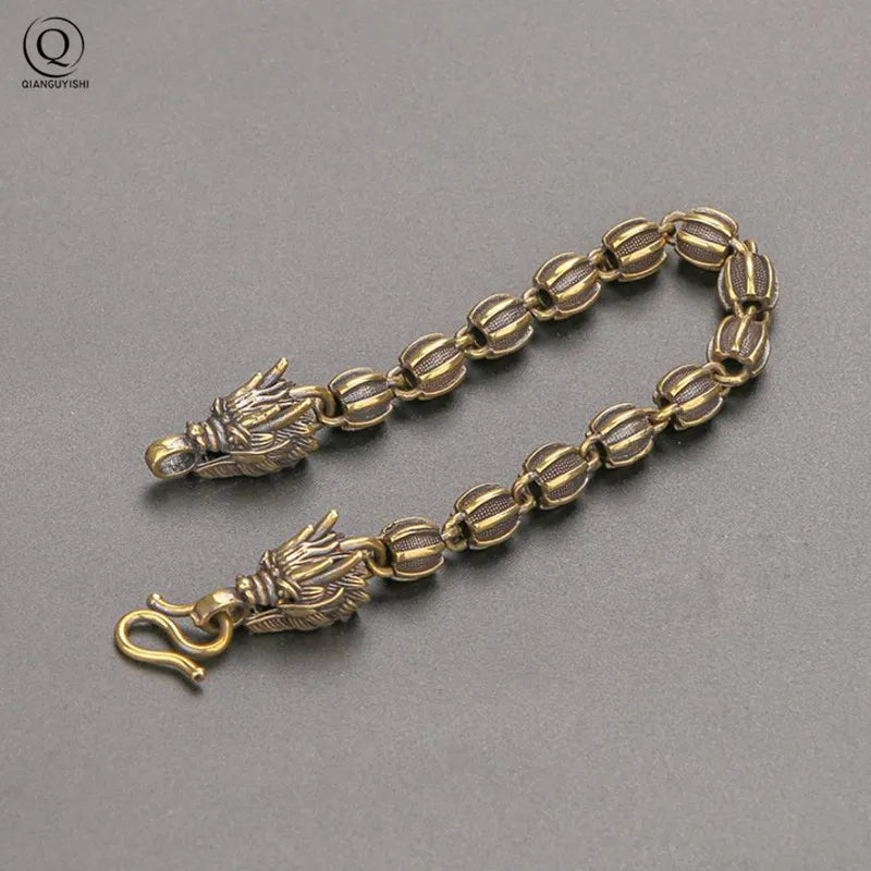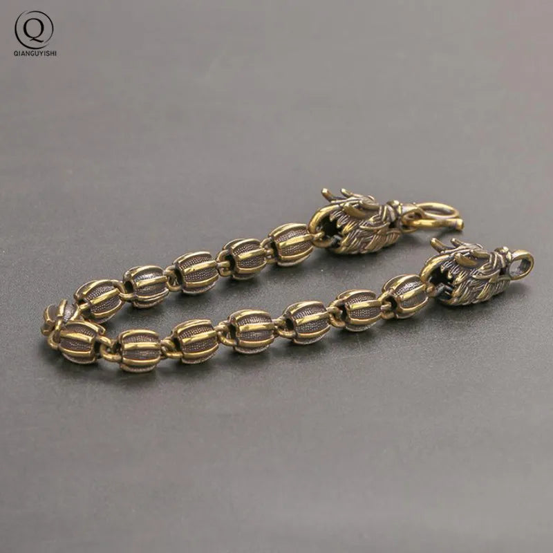This unique bracelet features a pure brass dragon head with watermelon lines chains and Buddhist beads. It has a vintage punk style that is perfect for men.