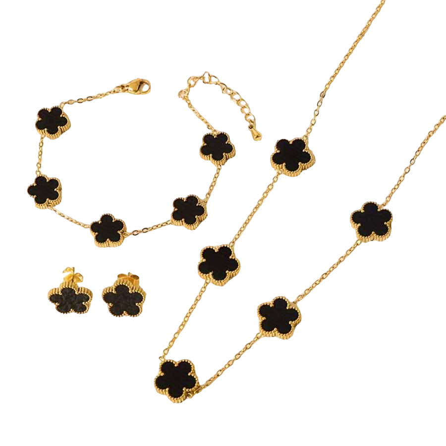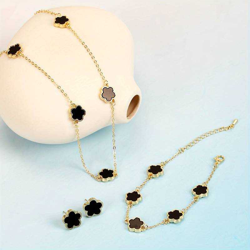 Women's 3 Piece Gold Plated Black Clover Flower Jewelry Set