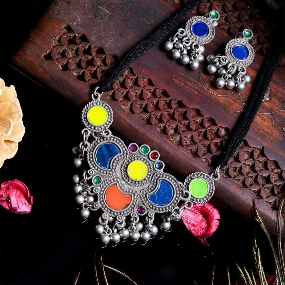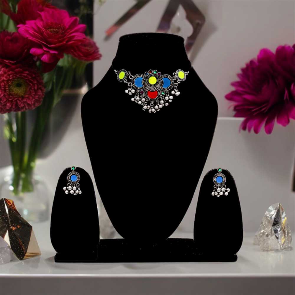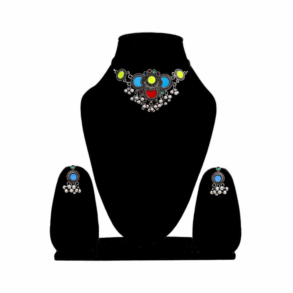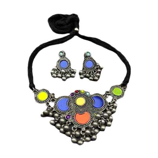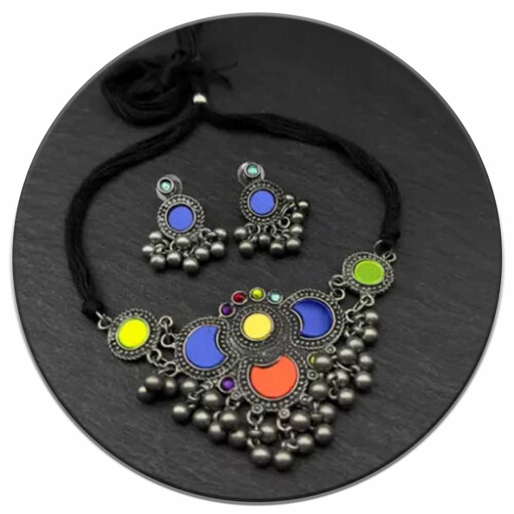 Women's Black Silver Oxidized Choker Set With Tassel Beads