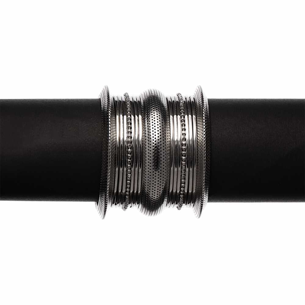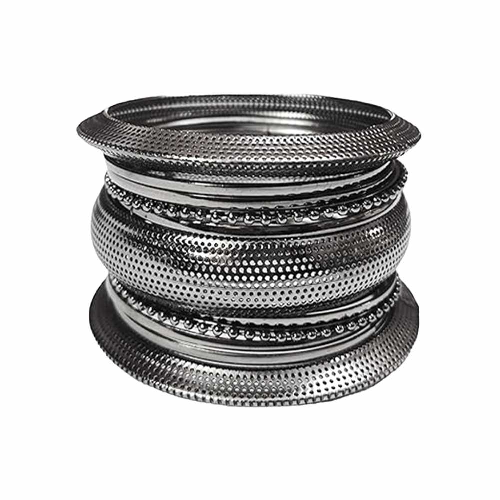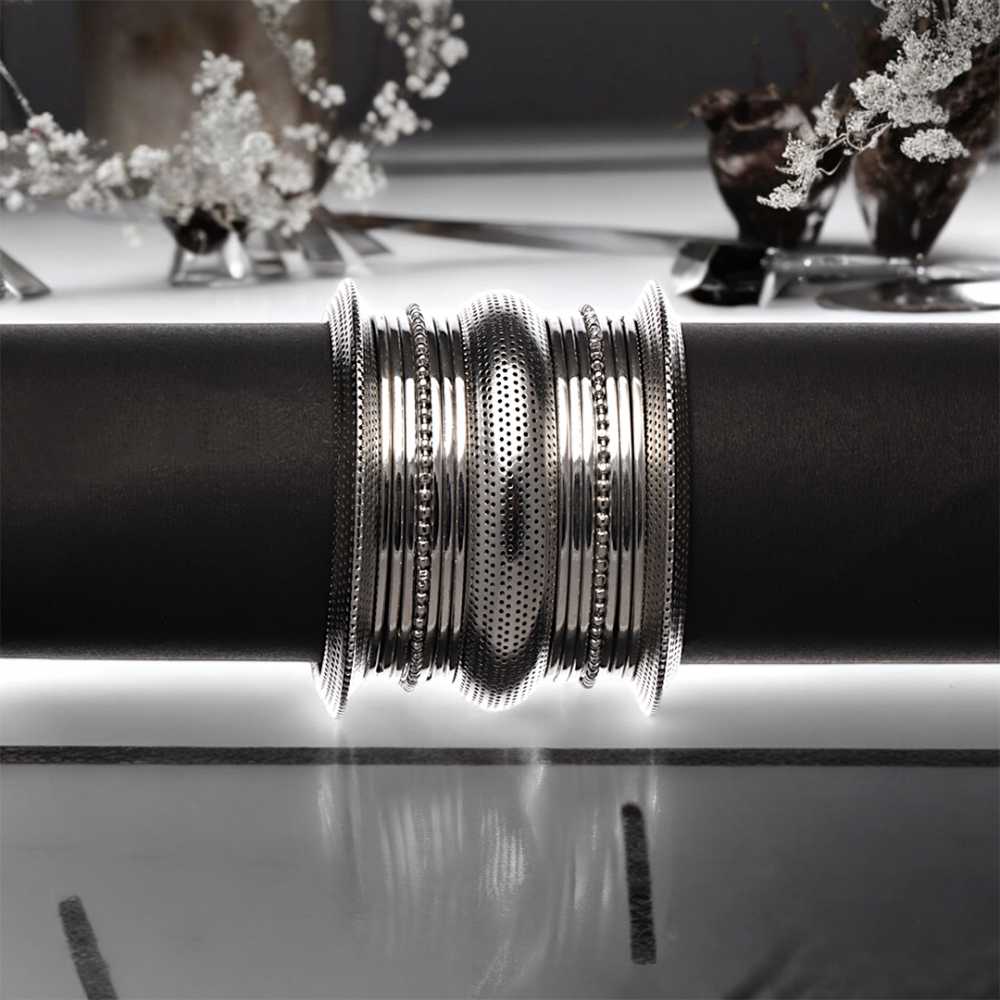 The bangle features a traditional Indian design known as Kada Bangle Set characterized by its broad and sturdy construction. The bangle is crafted in a circular shape, allowing it to slide comfortably over the wrist. The surface of the bangle is adorned with intricate cutwork, featuring geometric patterns, floral motifs, or other decorative elements. These cutwork designs are meticulously crafted by skilled artisans, adding visual interest and texture to the bangle. It is designed to fit comfortably and securely, without feeling too tight or too loose.