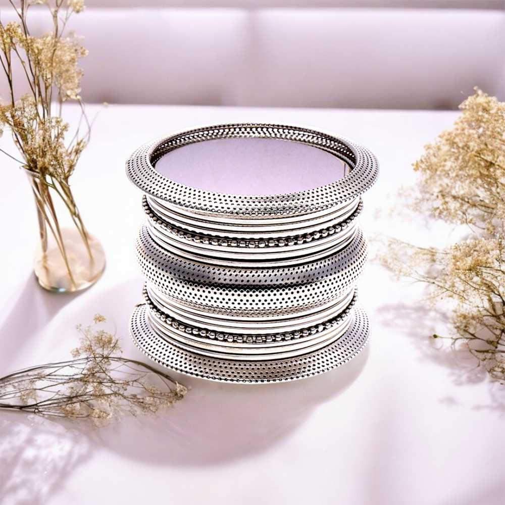 - Product Particulars: This kada bangle set is made of high quality silver plated with oxidized material.