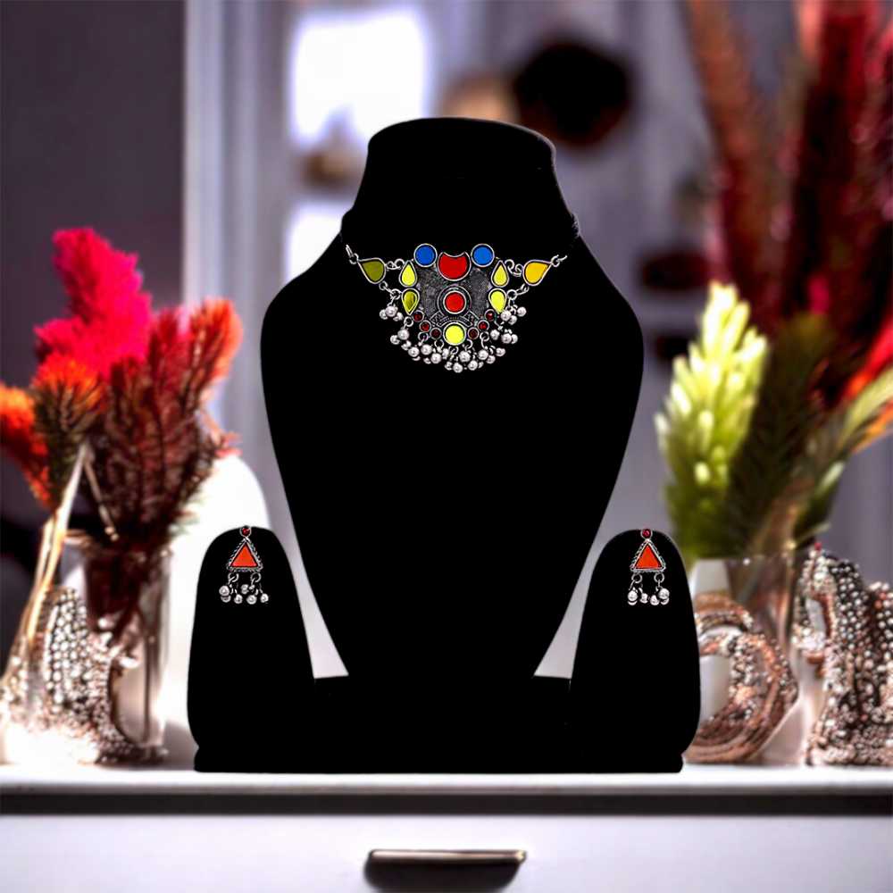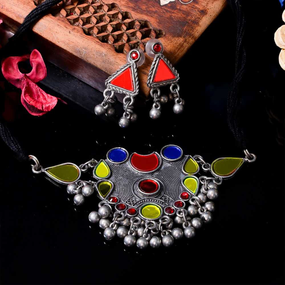 - Product Particulars: This multicolor mirror Jewelry set is made of high quality material plated with silver oxidized and studded with beads.