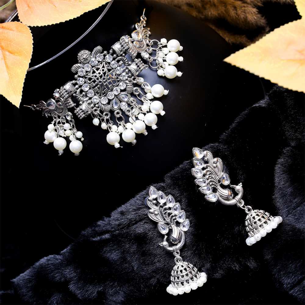 Women's Oxidized Peacock Design Jewelry Set With Pearls