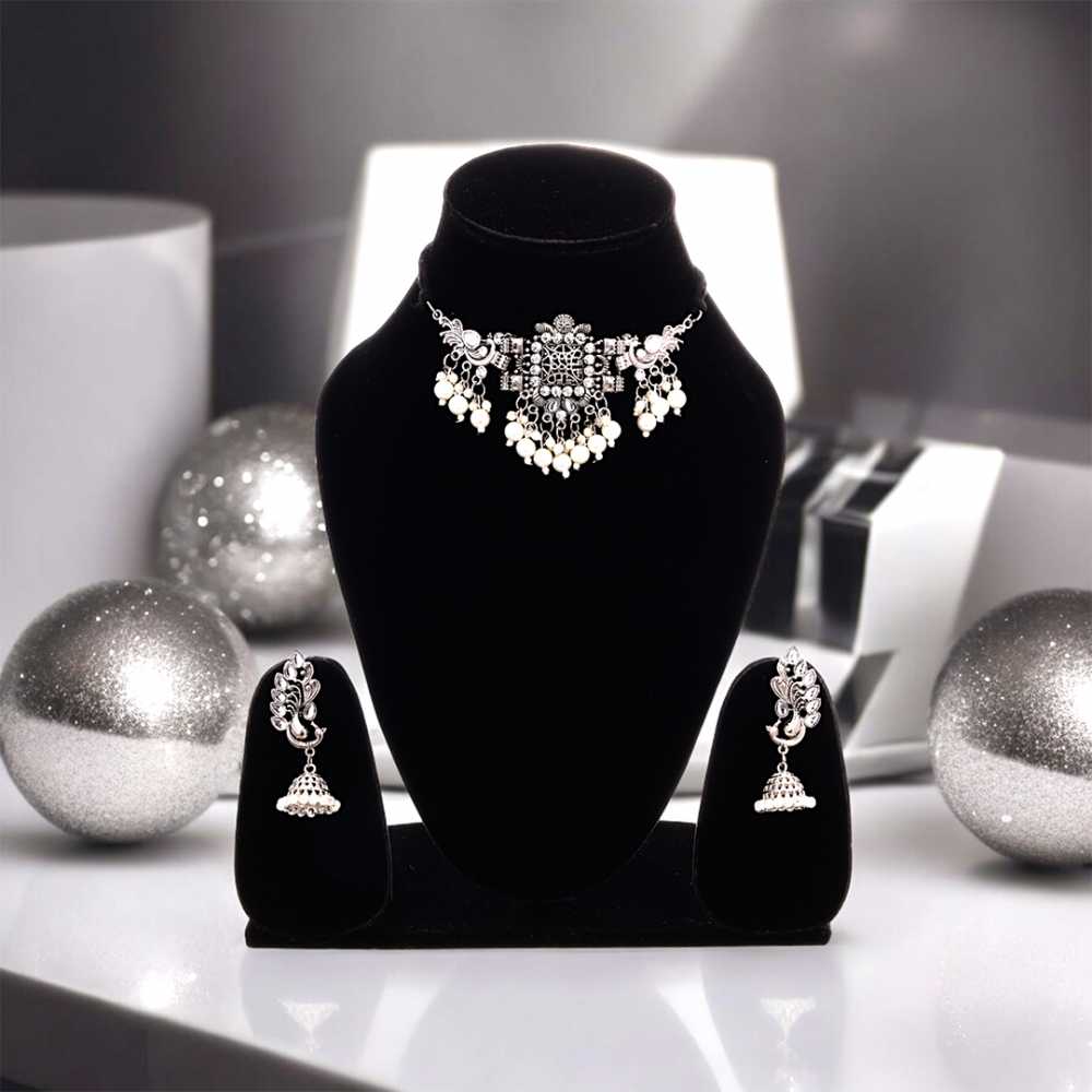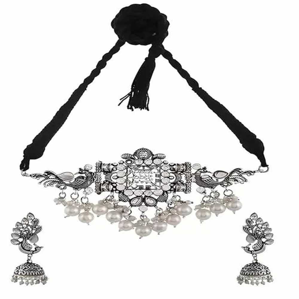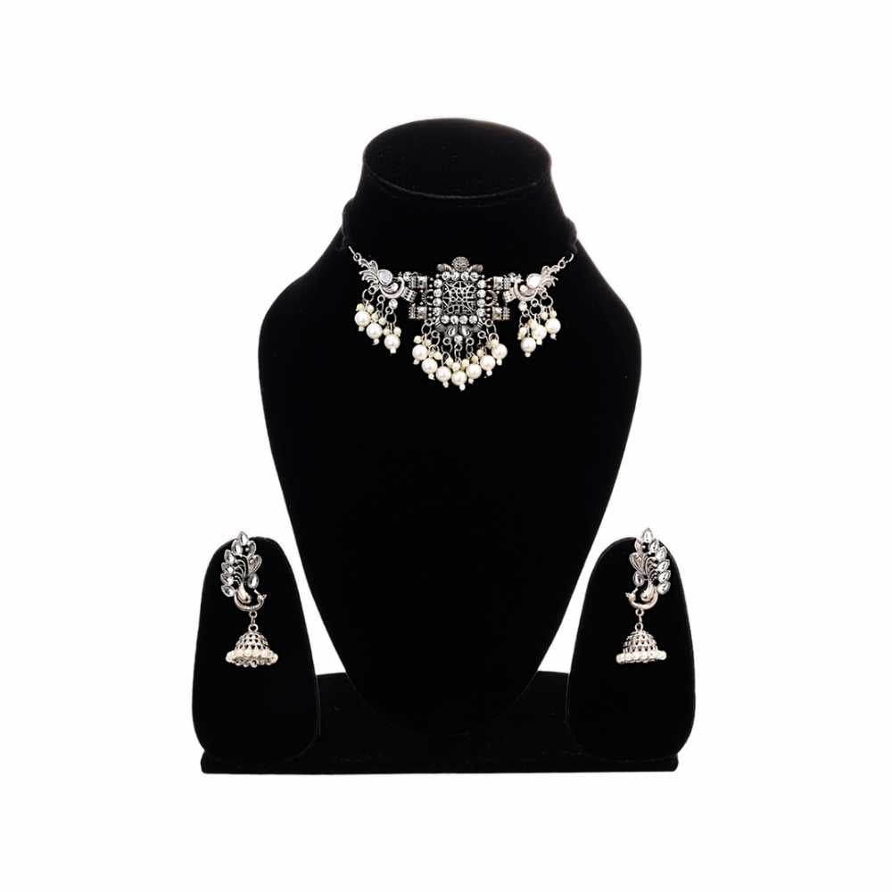 - Product Particulars: This Jewelry set is made of high quality material plated with silver oxidized and studded with pearls and stones.