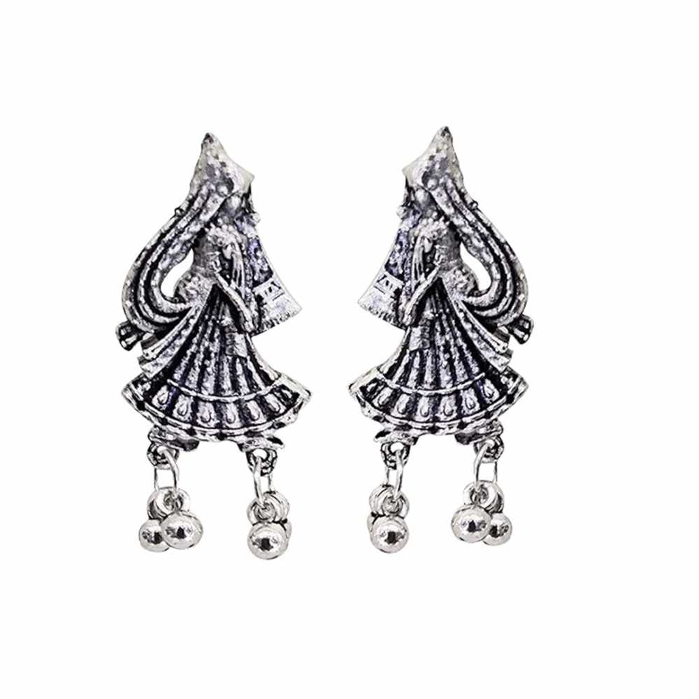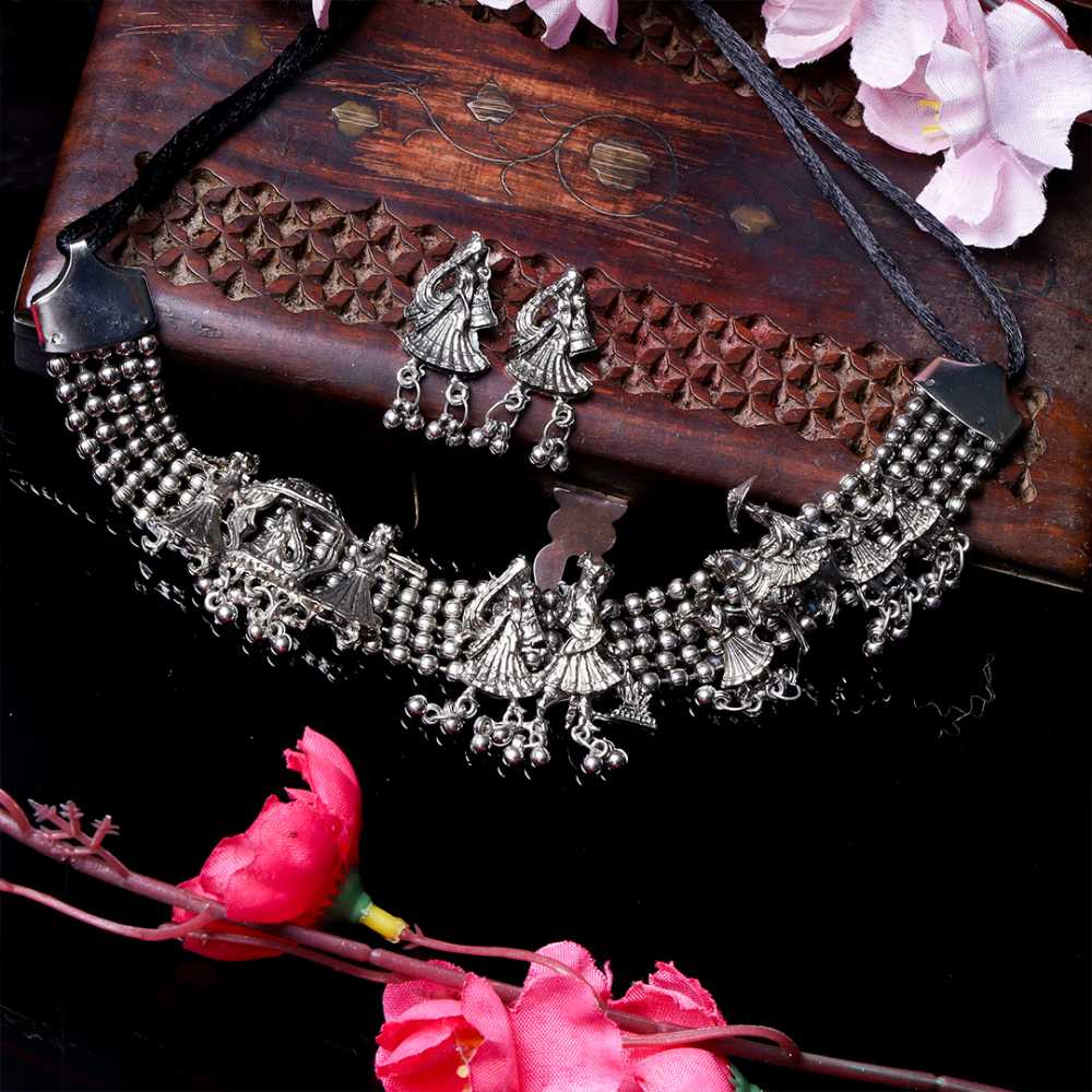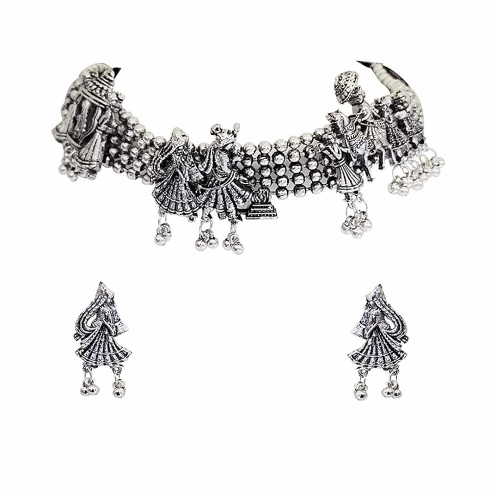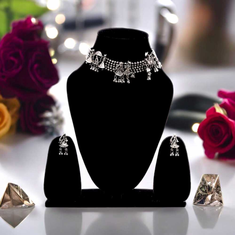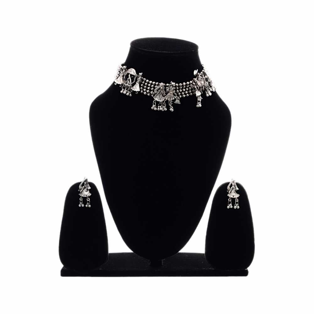 Women's Silver Plated Oxidised Indian Groom And Bride Themed Jewellery Set