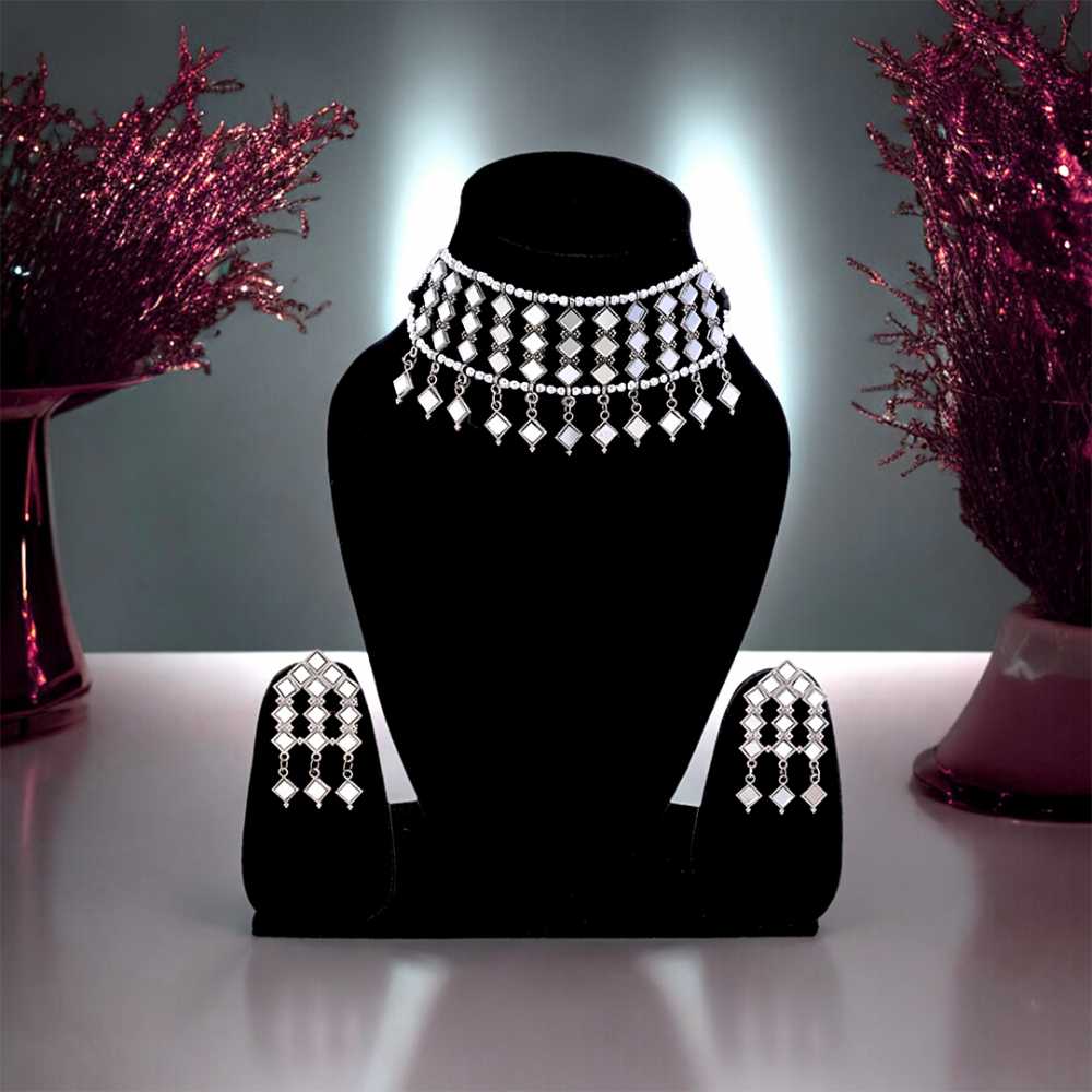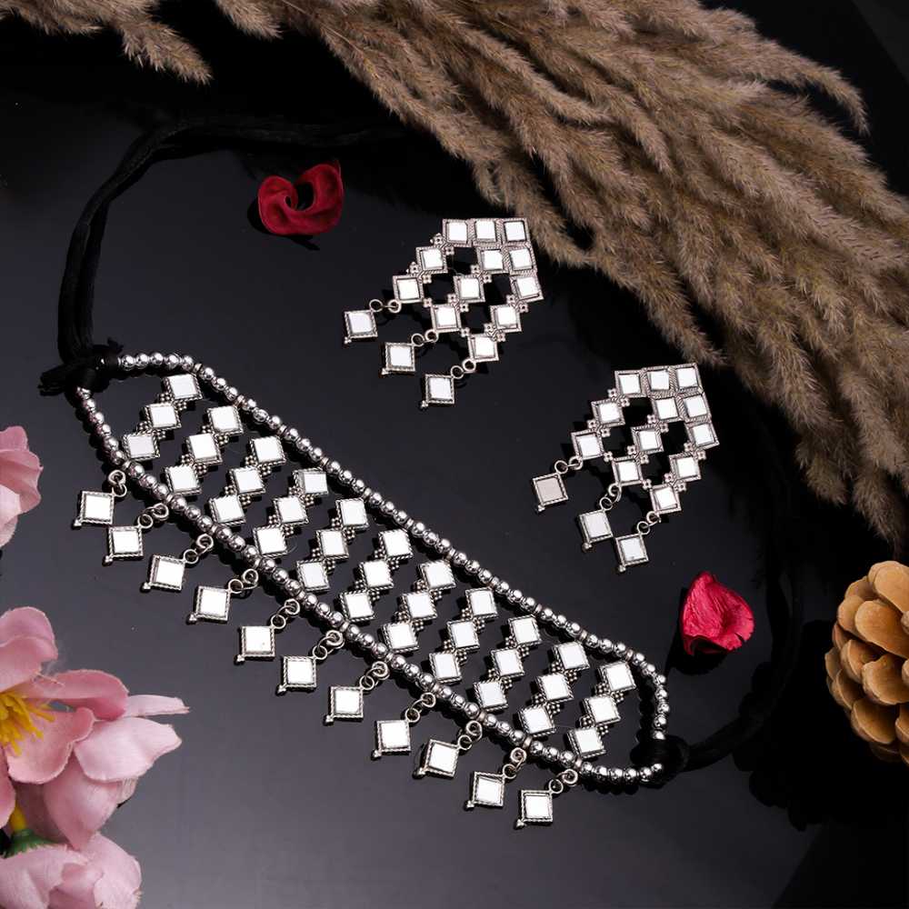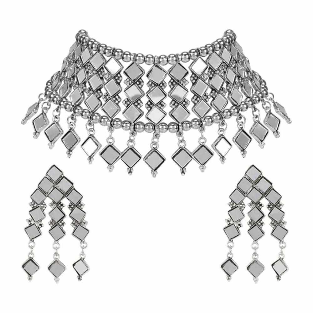 - Product Particulars: Crafted from high quality silver plated oxidised material with mirror work. The choker comes with rope yoke part and the earring secured with push back closure.