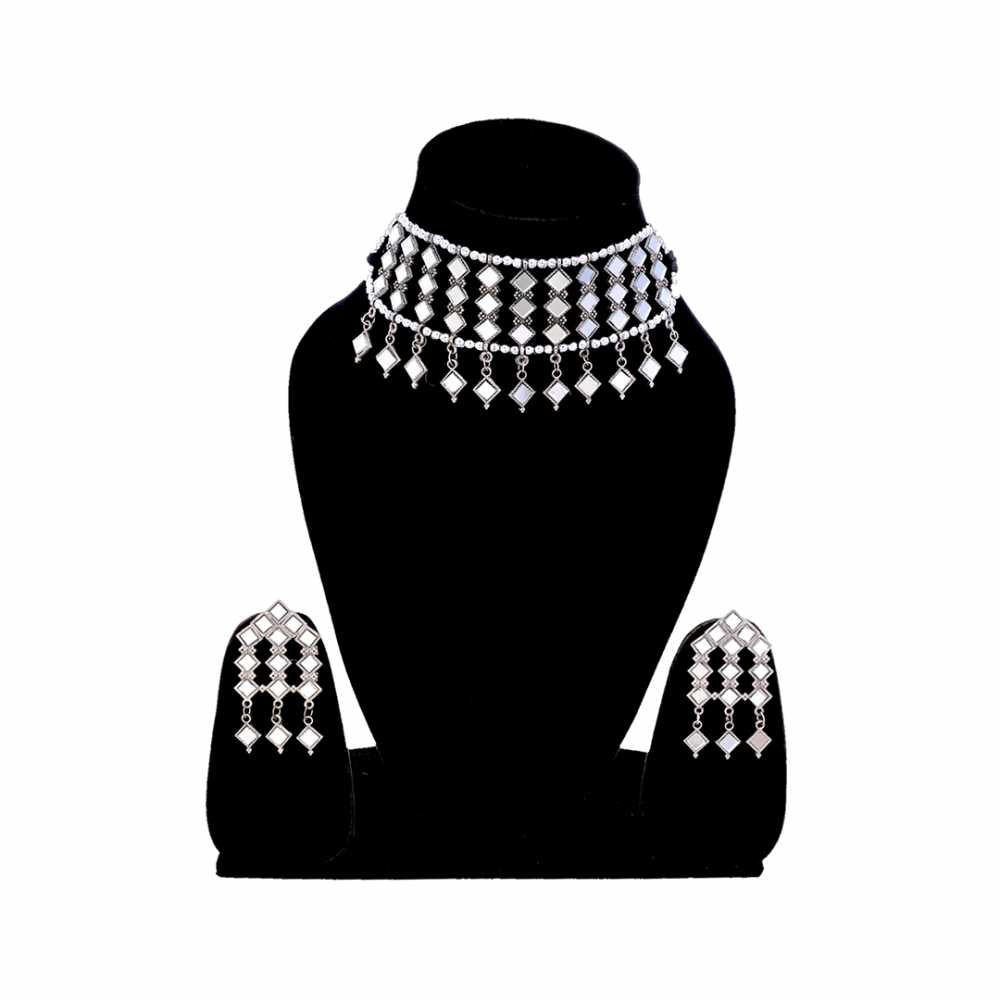 Women's Silver Plated Oxidised Mirror Embossed Choker Jewellery Set