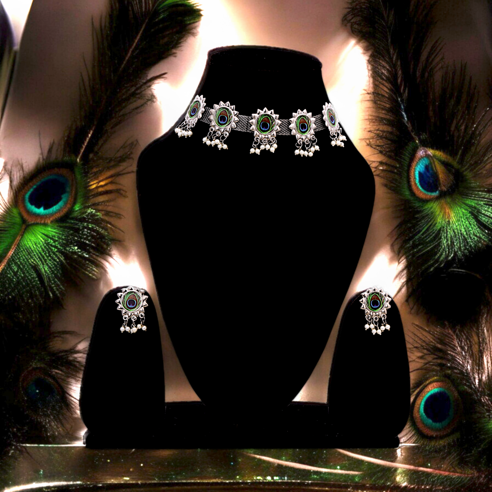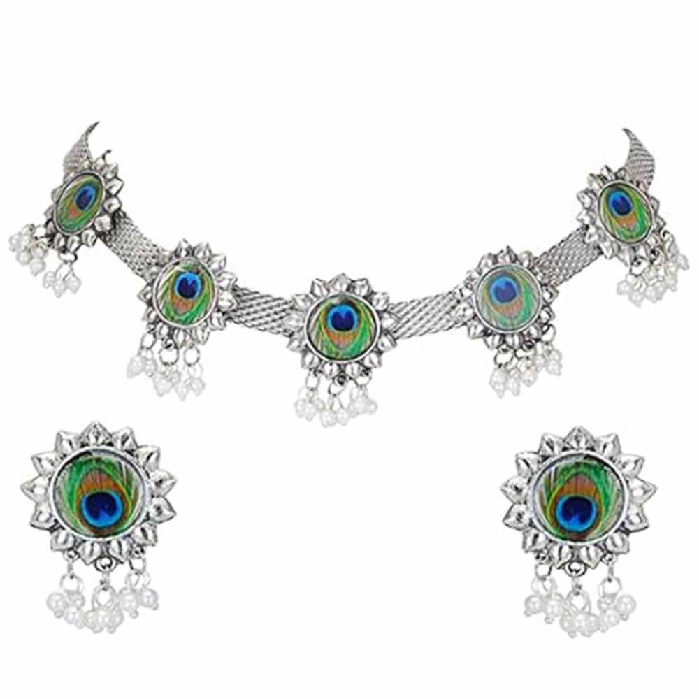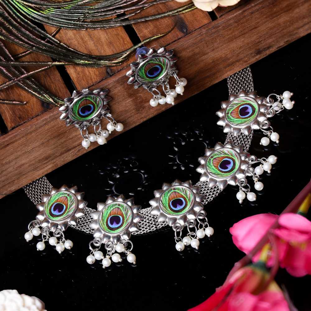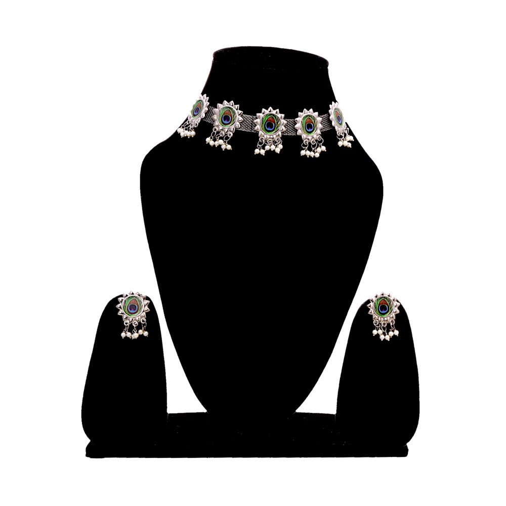 Women's Silver Plated Oxidised Peacock Feather Pearl Drop Choker Jewellery Set