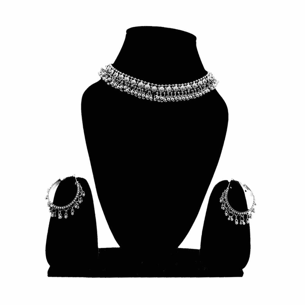 - Product Particulars: Crafted from high quality silver plated oxidised metal, the choker necklace comes with cable chain and earring secured with latch back findings.