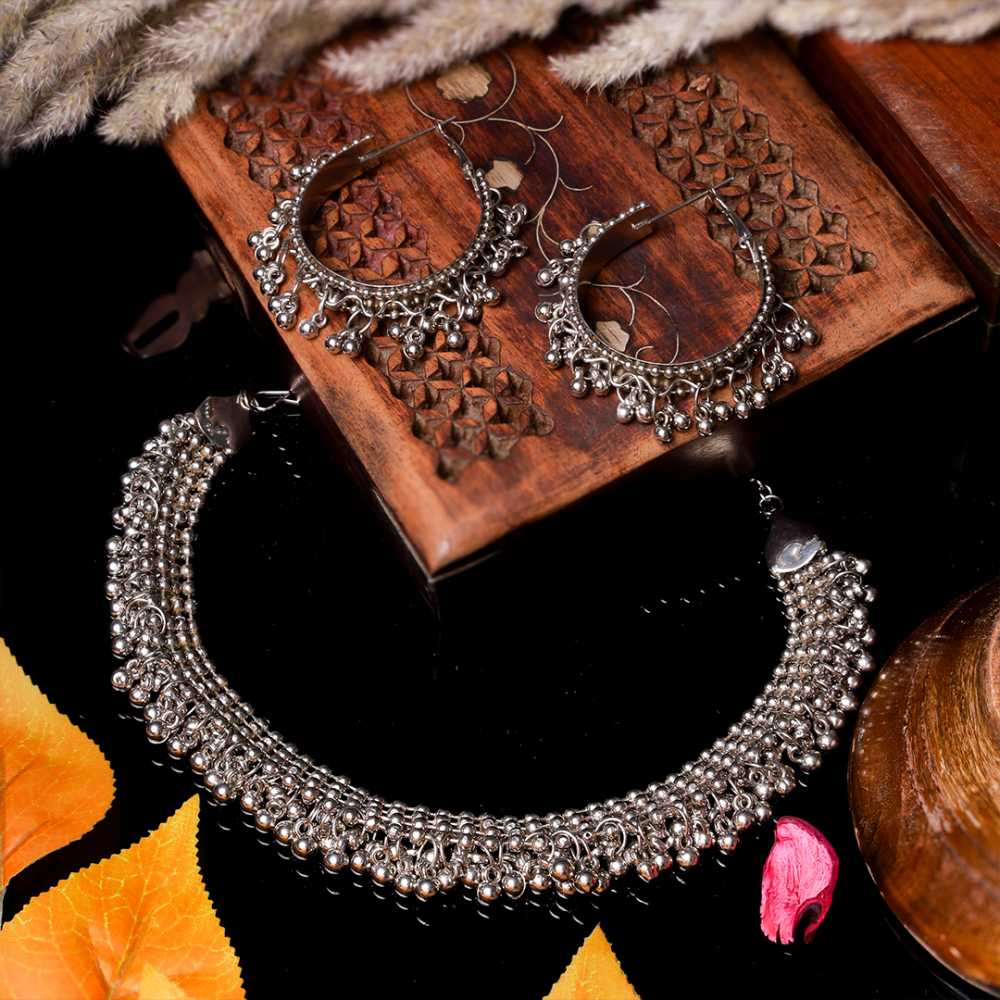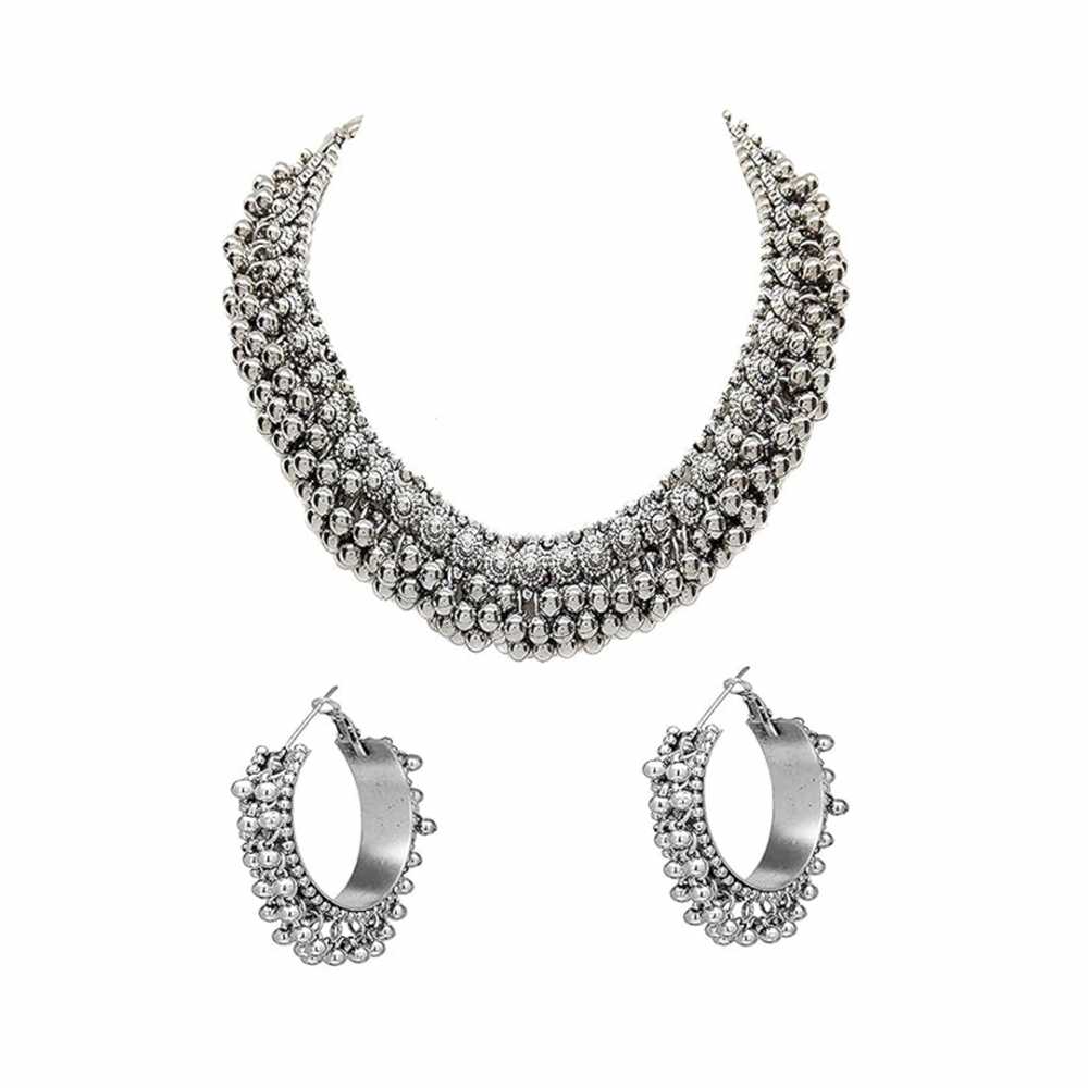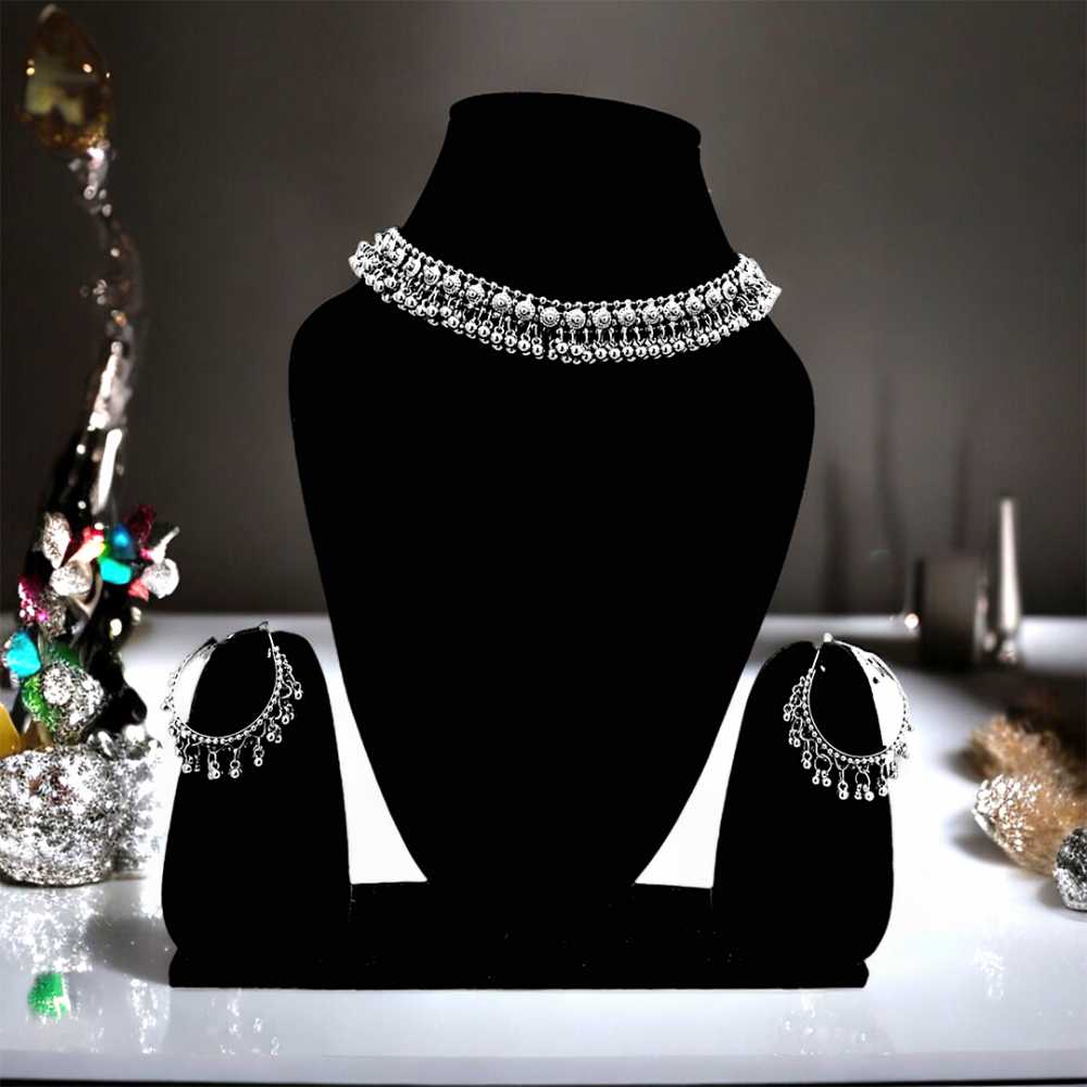 Women's Silver Plated Oxidised Tassel Beaded Choker Jewellery Set