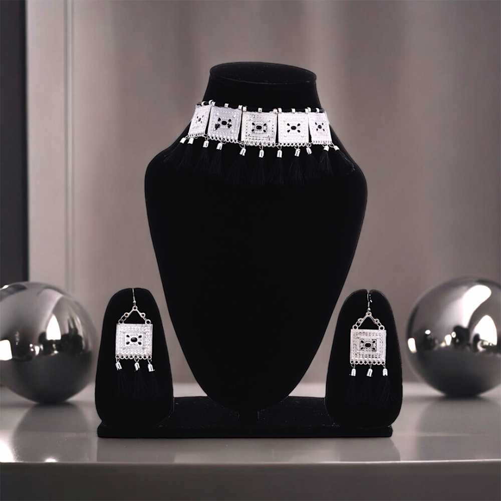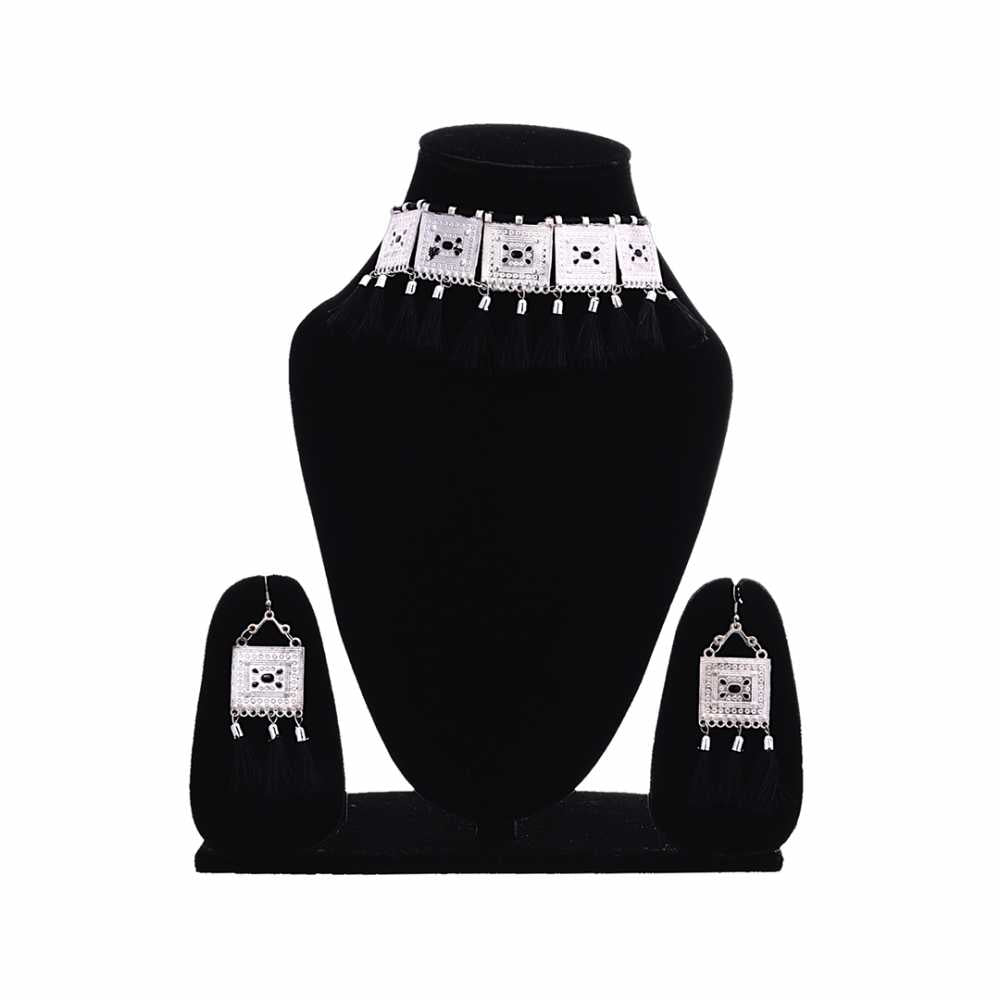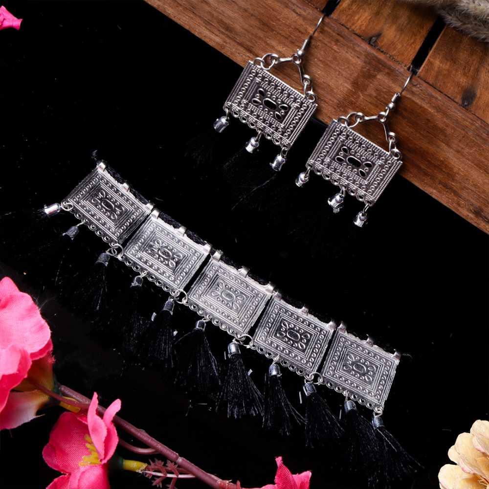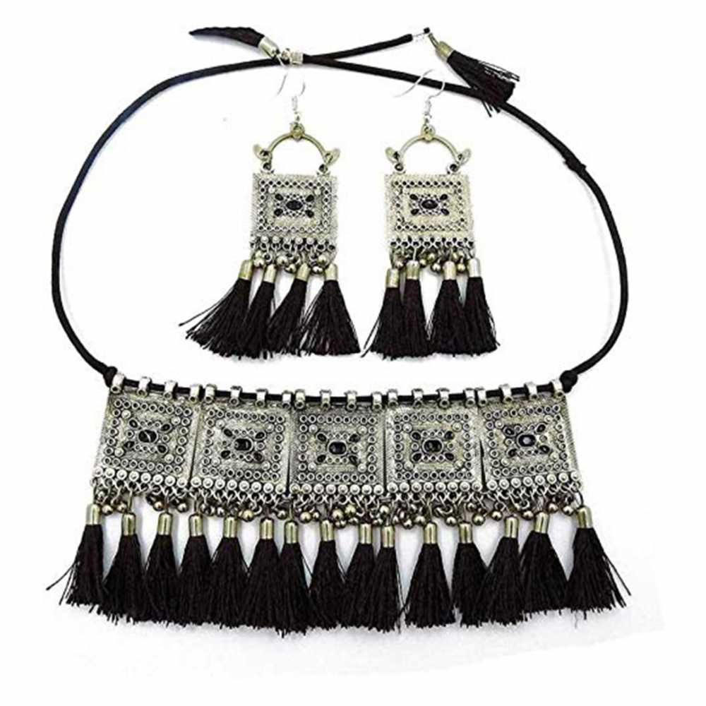 Women's Silver Plated Oxidised Tassel Drop Choker Jewellery Set
