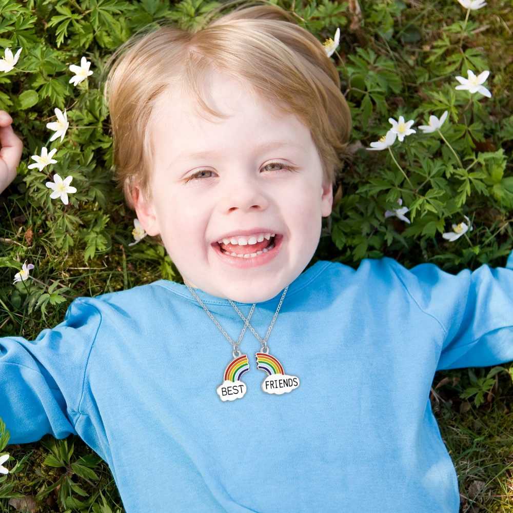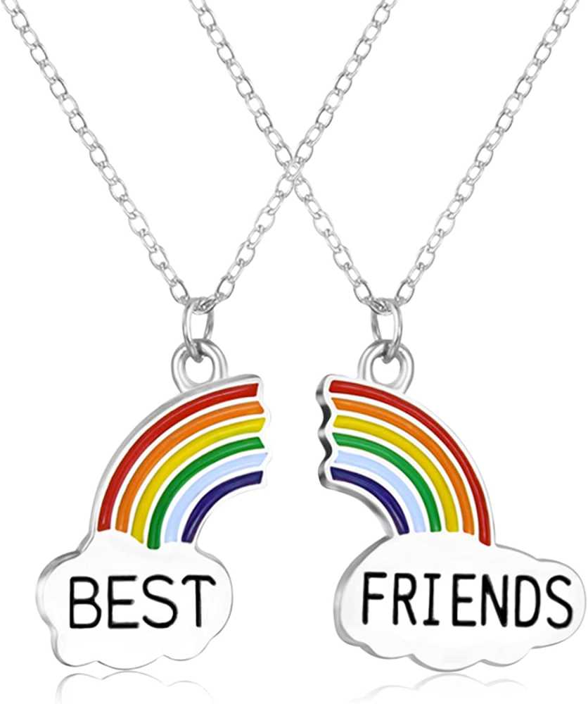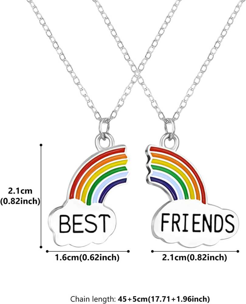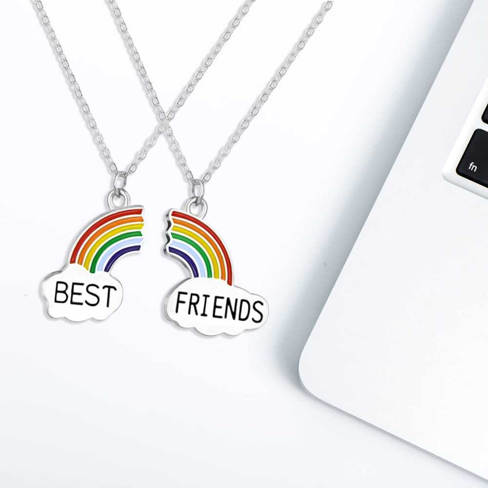 The necklace is a delightful and stylish accessory that beautifully combines elegance with a touch of whimsy. Crafted with precision and care, this necklace features a radiant silver plated chain that complements any ensemble with a subtle, yet sophisticated shimmer. The centerpiece of this necklace is a charming pendant designed in the shape of a rainbow. The rainbow is delicately adorned with an array of vibrant and eye catching colors, symbolizing diversity, unity, and the beauty of friendship. Each color seamlessly transitions into the next, creating a harmonious and visually appealing spectrum. The pendant serves as a symbol of the strong bonds shared between friends, making it an ideal gift to celebrate meaningful connections. The silver plated finish not only adds a timeless touch to the piece but also ensures durability and longevity. Whether worn casually or as an accent to a more formal outfit, this necklace is a versatile and meaningful accessory. It not only adds a touch of style to your wardrobe but also carries a sentiment of unity and camaraderie, making it a cherished piece for those who appreciate both fashion and the value of true friendship.