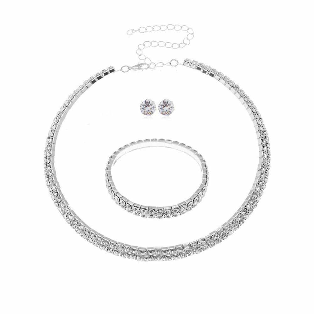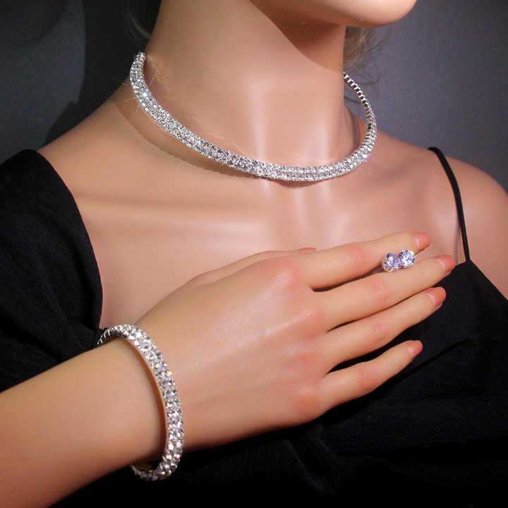 - Product Particulars: Crafted from high quality zinc metal plated with silver and embossed with cubic zirconia stones. The choker necklace comes with an adjustable fit, whereas the stud secured with push back closures. The bangle type bracelet is of stretchable type.