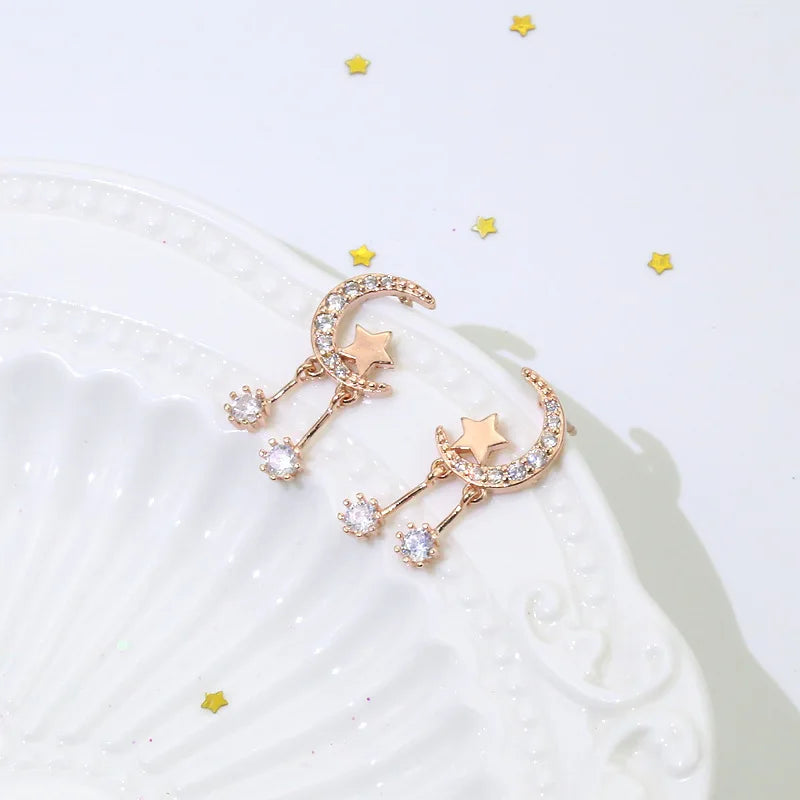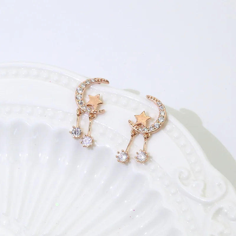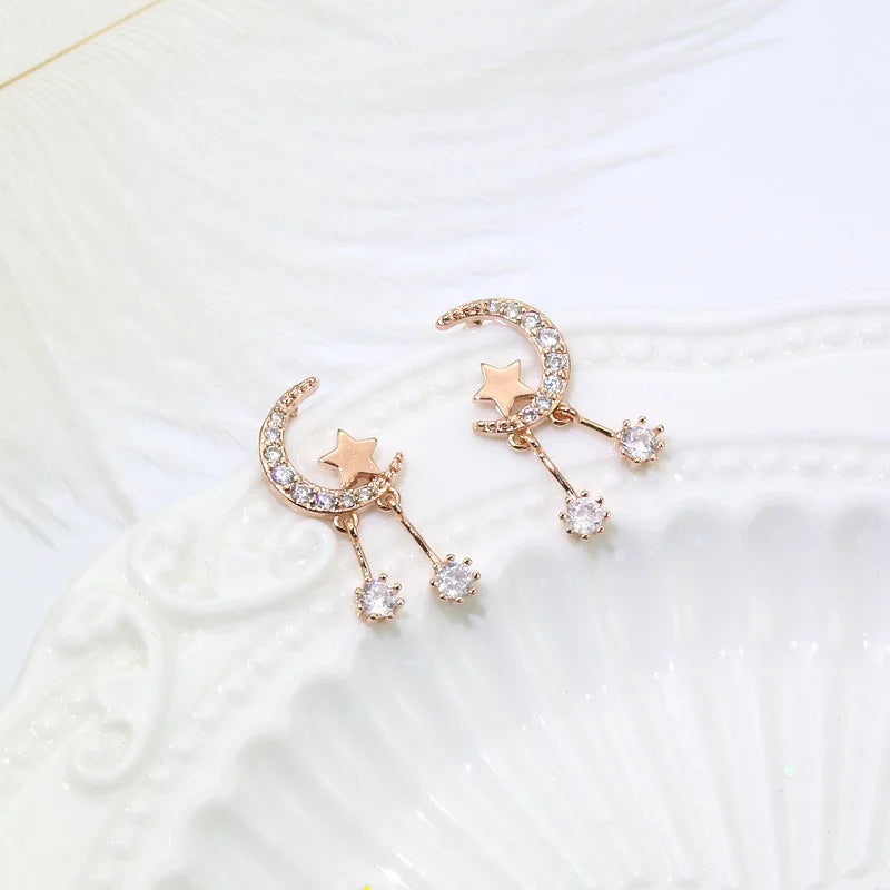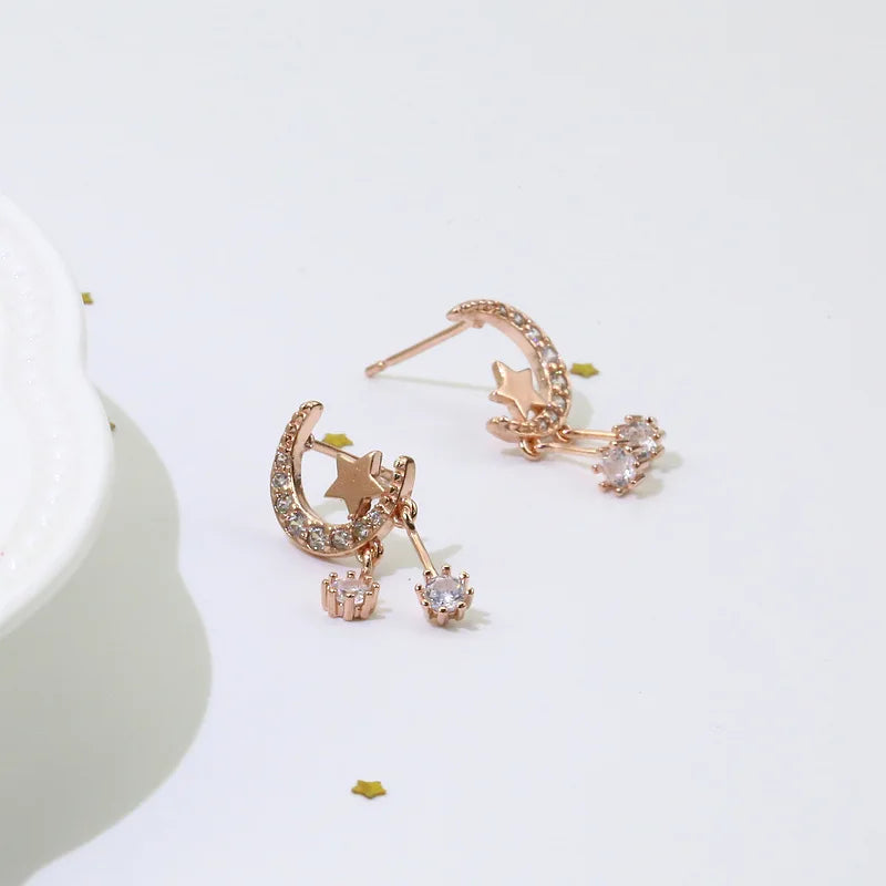 Enhance your style with these elegant silver earrings featuring a rose, star, moon, and zircon accents.