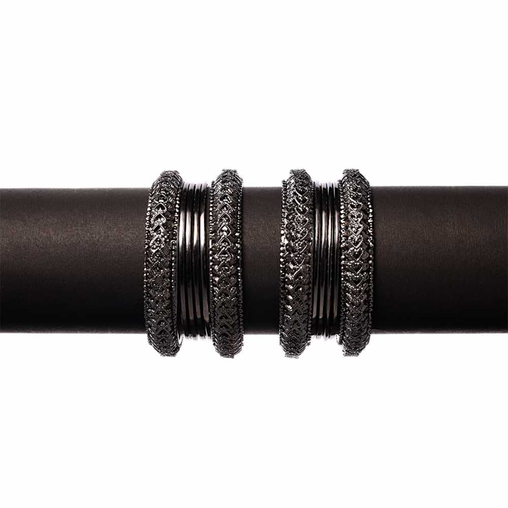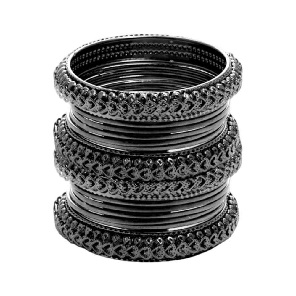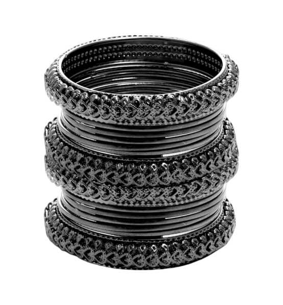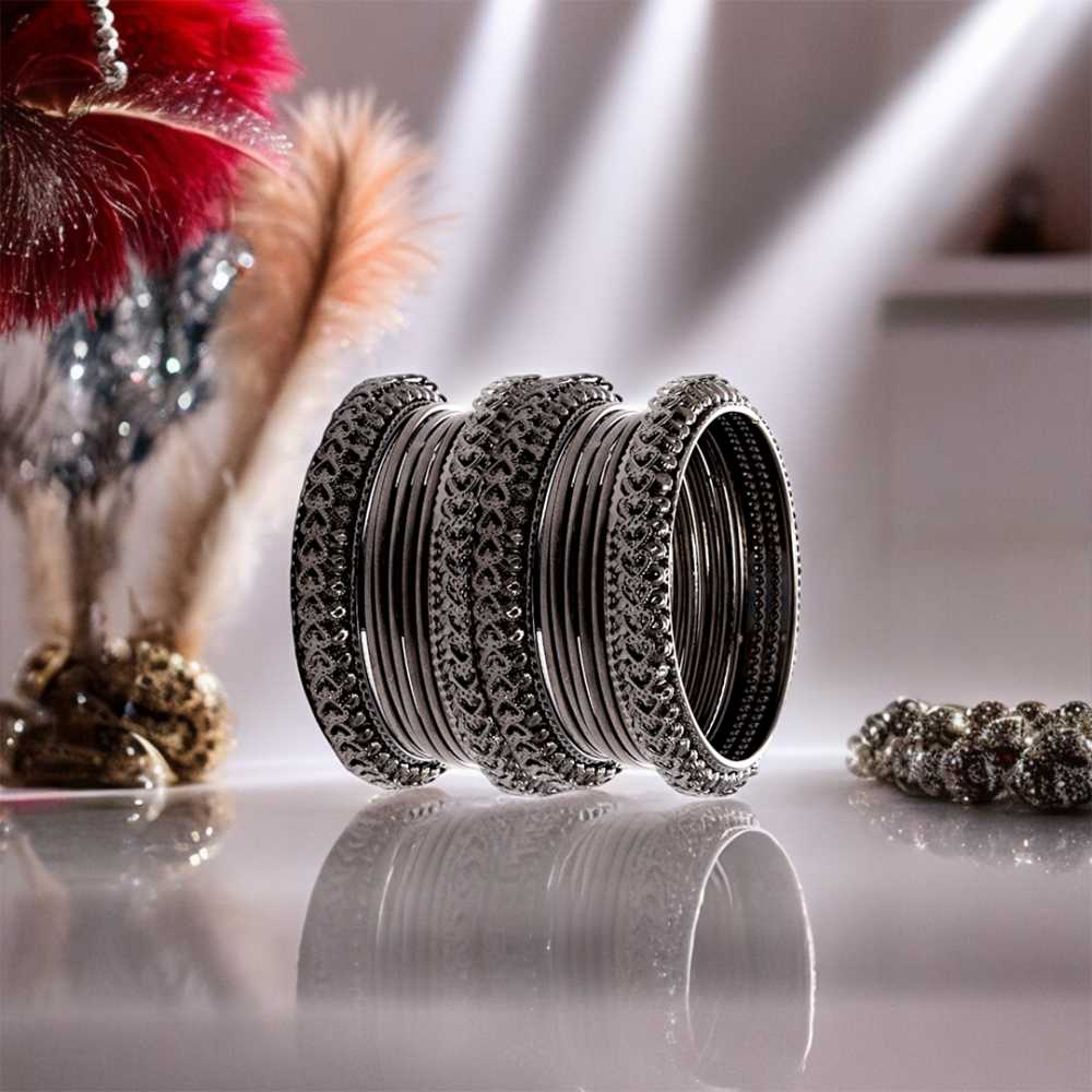 - Product Particulars: This traditional bangle set is made of high quality material plated with silver black oxidized.