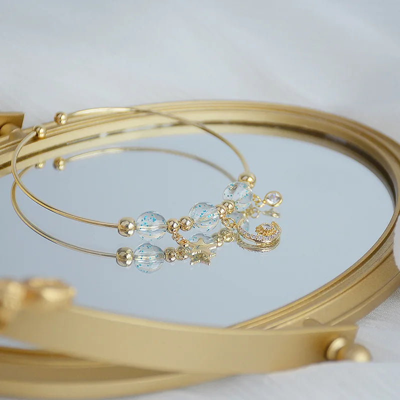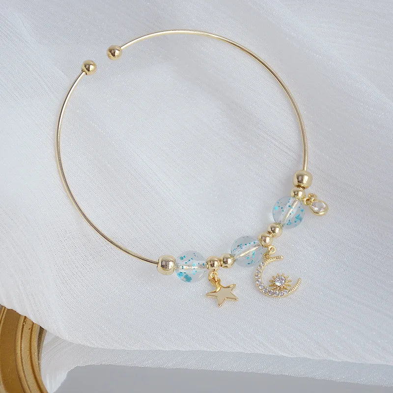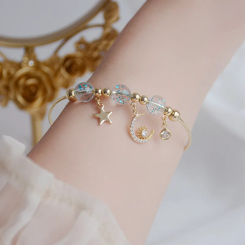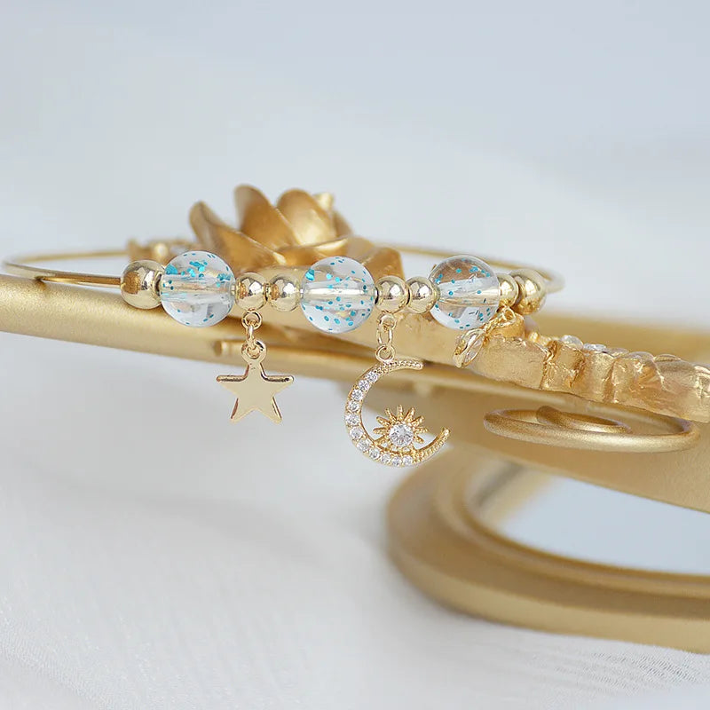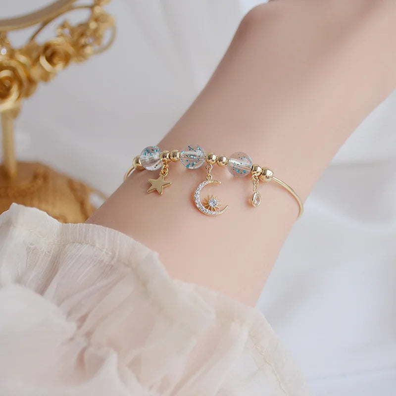 Elegant bracelet adorned with delicate zircon CZ moon and star charms, made with 14K real gold plating and sparkling crystals.